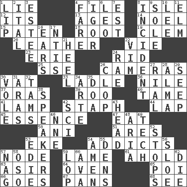 ACROSS 1. Whopper 4. Do some clerical work 8. Small island 12. It is 13. Matures 14. Christmas carol 15. Eucharist need 18. Carrot, for example 19. To starve (Brit.) 20. Cordwainer's material 22. Compete 23. One of the Great Lakes 24. To free from 25. Compass dir. 26. Devices for capturing images 30. Large container 33. Dipping utensil 36. "Death on the ____" 37. Mouths or openings 39. Friend of Pooh 40. Docile 41. Desk light 42. Staphylococcus 44. Pet locale 45. Center 47. Consume 50. Black tropical American cuckoo 51. Ancient Greek god of war 53. Supplement with great effort 54. Inveterate users 57. Thickened enlargement 59. Unable to walk 61. Hold, grip (Informal) 63. SW Saudi Arabia district 64. Baking chamber 65. Luau course 66. Moves 67. Zero-star reviews 68. Perceive with the eye DOWN 1. Mouth edge 2. Slanted text style (abbr.) 3. First name in cosmetics 4. Conductor's collection 5. Russian composer Stravinsky 6. Lion 7. Eastern Standard Time (abbr.) 8. Happening 9. Not divided or shared with others 10. Area sheltered from the wind 11. Shade tree 16. Hearing organs 17. Nuclear Threat Initiatives 21. The bottom of a shoe or boot 22. Zeal 24. Actress Charlotte 26. Hoof sound 27. Monetary unit of Yemen 28. _ mater 29. Ooze 30. Grand slam 31. Ancient river in northeast Turkey 32. Scottish caps 34. Johnson of "Laugh-In" 35. ___ good deed 38. Orators 42. _-fi 43. Froth on beer 46. Compass dir. 48. Operatic vocal solo 49. Technology 52. Obstructs or blocks passage 53. Singer Brickell 54. So be it 55. Cub Scout units 56. _ gin 57. Tired old horse 58. Bear (Spanish) 59. Trim (branches) 60. Actress Gardner 62. Pass on