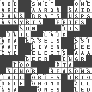 ACROSS 1. Lower and raise head in agreement 4. Stricken, poetically 8. Single 11. "We ___ not amused" (Victoria) 12. Composer Copland 14. Stated 15. Baking dishes 17. Naughty children 18. United States Postal Service (abbr.) 19. Nineveh was its capital 21. Strips of potato fried in deep fat 23. Player for Phoenix 24. ___ a Wonderful Life 25. International (abbr.) 27. Put down 30. Housemaid (var.) 31. Artist's stands 34. Fast jet (abbr.) 37. Large container 38. Make or become more lively 39. Area sheltered from the wind 40. Sight organ 41. Chooses 43. American Automobile Association (abbr.) 44. Fermented drink made from hops 45. Engineer (abbr.) 47. Egg _ yung 49. Parent Teacher Assoc. 50. Sir (Sp.) 52. Thinks logically 56. Baby powder 57. Off-Broadway awards 60. Musical group of three 61. Stare at amorously 62. U. of Maine site 63. Everything 64. Girls' org. (abbr.) 65. Singles 66. Directed DOWN 1. California wine valley 2. Mouths or openings 3. Hiding places for outlaws 4. Unit of acoustic absorption 5. Hindu Mythology: god of death 6. Lyricist Gershwin 7. Small child 8. Fertile tracts in a desert 9. Cuts off 10. Begley and Asner 13. Science/research agcy. 14. Set of matching outer garments 16. System (abbr.) 20. General guideline 22. To free from 25. "If ____ say so..." 26. Nathan's nickname 27. Crowbar 28. Actor Baldwin 29. Is not 30. "___ Maria" 32. Toward shelter 33. Filth; sediment 34. Volcanic refuse 35. Scorch 36. Afternoon social gathering 42. Stalk of a moss capsule 44. Oct. 31 cry 46. Political cartoonist Thomas 47. Chap (slang) 48. Single time 49. Mexican monetary units 50. Sinks 51. Friend of Pooh 52. French philosopher Descartes 53. Of the mouth 54. Mediterranean tributary 55. Exchanged or delivered for money 56. Coat; cloak 58. Sis' sibling 59. Electrically charged atom