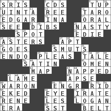 ACROSS 1. Indian titles of respect 5. Music discs 8. Uncastrated adult male sheep 11. National forest in Provo, Utah 13. To sift 14. Pacific island yam 15. _ Allan Poe 16. _ tizzy (2 wds.) 17. Relating to the mouth 18. Perceive with the eye 19. Claim 21. Smutty 22. Specific locale 24. Singer Brickell 25. Michaelmas daisies 27. Fitting 29. Travels 30. Obscenities 32. Inside; within (prefix) 33. Entreaties 35. Lie 39. Smooth fabric 41. Sign of things to come 42. Atlas unit 43. Slept 45. Unable to walk 48. Domed church section 49. Make _____ (do battle with) 50. Engineer (abbr.) 52. To free from 55. Made supply last 56. Sight organ 57. Feeling or showing extreme anger 59. French philosopher Descartes 60. French article 61. Utah city north of Ogden 62. Epoch 63. Fast jet (abbr.) 64. Waist strap DOWN 1. Takes to court 2. Travel on an animal 3. Swallowed 4. R.R. building 5. Baby bed with high sides 6. Lairs 7. Ocean 8. Tarsus (plural) 9. A salt of uric acid 10. More than one (prefix) 12. Zeal 14. Frog relative 20. It is 21. Remaining after all deductions 23. Mexican monetary units 25. Mature 26. Male offspring 27. Wet nurse (var.) 28. Tenth month of the Hindu calendar 30. Elected rep. 31. Ceases 33. Parent Teacher Assoc. 34. Mouth edge 36. Electrical Measurement 37. Area sheltered from the wind 38. Conclude 40. So be it 43. Tired old horse 44. Showery time 45. Member of a famous L.A. basketball team 46. Sports stadium 47. Method 49. We are 50. Sight organs 51. Egg locale 53. Slanted text style (abbr.) 54. Gouge 56. Raised railways 58. Director Reiner