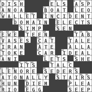 ACROSS 1. Food container 5. Raised railways 8. Viper 11. Small Philippine buffalo 12. Water vessel 13. Lion 14. Place for singles 17. Happening 19. Realm 21. Chooses 22. Simple or foolish person 23. Elected rep. 24. She-sheep 27. Adolescent 29. Bar bill 32. Flower holders 34. Domesticated feline 36. Story 37. SW Asia republic 38. Had dinner 39. Silent film actress Nazimova 40. Casino tip 41. Auto 42. Standard of perfection 43. Black tropical American cuckoo 44. Allows 46. A female animal or person 47. It is 50. Baby powder 52. Poe poem 55. Spring feasts 57. Lacking a tonal center or key 59. Flight of steps 62. Attila the _ 63. South Vietnam president (1954) 64. Entreaty 65. River (Sp.) 66. Oval reproductive body of a fowl 67. Ooze DOWN 1. Simpleton 2. _ tizzy (2 wds.) 3. Exchanged or delivered for money 4. Radiant circles of light 5. Period of immesurable duration 6. Shoestrings 7. Vertical member of a panel or frame 8. Actor Baldwin 9. Emitted 10. Plant holders 12. Storage container 15. Gives off 16. Docile 18. Lair 20. Medicinal drug used to evoke vomiting 24. Webber/Rice musical 25. Make _____ (do battle with) 26. 1973 Nobel Price Winner (Physics) Leo 28. Brizilian seaport 29. Stories 30. Assad's deity 31. Calif. Air Force Base 33. Compass dir. 35. Cigar-shaped 36. Small amount or degree 42. Small island 45. Small amounts or degrees 47. Electrically charged atom 48. Swap 49. Former Milwaukee Brewers owner Bud 51. Dice game 52. Cowardly lion portrayer 53. Needle holder 54. Words to Nanette 55. Symbol (abbr.) 56. Filth; sediment 58. Part of a journey 60. To sift 61. Plant excrement