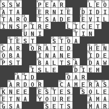 ACROSS 1. Compass dir. 4. Lightbulb-shaped fruit 8. Lion 11. "One Day ___ Time" 12. Bert's buddy 14. "You Light Up My Life" star Conn 15. Pacific island yam 17. Sadhe (variant) 18. Morally bad or wrong 19. Motivate 21. It is permitted: Lat. 23. Single; one (prefix) 24. Metal container 25. Trial 27. Portico 30. 4-wheeled motor vehicle 31. Spoke pompously 34. Layer 37. Chief or king in Benin or Nigeria 38. Empty; void 39. Binary compound 40. Pacific Standard Time (abbr.) 41. Greek mezzo-soprano Agnes 43. Obsolete 44. Small island 45. South Vietnam president (1954) 47. Assist 49. Rowing implement 50. Zeal 52. Devices for capturing images 56. Leg joint 57. _____ Park, CO 60. Not divided or shared with others 61. Inactive volcano in Sicily 62. You are 63. Wet nurse (var.) 64. Girls' org. (abbr.) 65. Arranges properly for use 66. Third mo. DOWN 1. Suttee (variant) 2. Comedian Laurel of Laurel & Hardy 3. Armed conflicts 4. _ dish (used to culture cells) 5. Celtic language 6. Santa ___, CA 7. To free from 8. Make or become more lively 9. Prepare for publication 10. Lubricate 13. Snakelike fish 14. Tenth: prefix 16. Musical composition 20. To the inside or interior of 22. Call ___ day 25. Bar bills 26. Part of Q.E.F. 27. Lacking originality or spontaneity 28. Portable shelter 29. Lyric poems 30. Police officer (slang) 32. Teases 33. Of or related to the anus 34. Flintstone garb 35. Dutch treat 36. ___ Haven, CT 42. First man 44. Wedding promise 46. Angers 47. Sports stadium 48. The content of cognition 49. Fertile tracts in a desert 50. Pismires 51. Marina Del _, California 52. Foregone conclusion 53. Wander 54. _ mater 55. Dry up 56. Cask 58. Distress signal 59. Third day of the wk.
