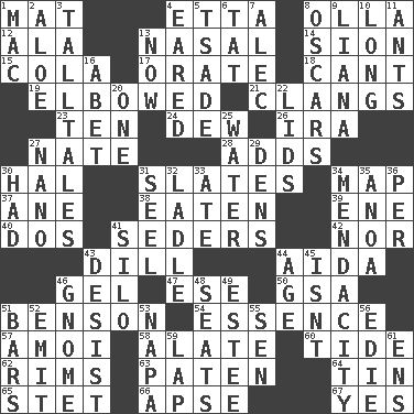 ACROSS 1. Floor covering 4. Singer James 8. Spanish pot 12. Wing 13. Rhinal 14. The Jewish people; Israel 15. Root beer relative 17. Declaim 18. Patter 19. Turned at an angle; bent 21. Gives out a loud, resonant sound 23. "___ Little Indians" 24. Morning condensation 26. Retirement account (abbr.) 27. Nathan's nickname 28. Does sums 30. Actor Linden 31. Chalkboards 34. Atlas unit 37. A saturated hydrocarbon 38. Ingested 39. Compass dir. 40. Two (Sp.) 41. Spring feasts 42. Or not 43. Deli pickle 44. Opera by Verdi 46. Set 47. Compass dir. 50. Girls' org. (abbr.) 51. Gillaume's butler role 54. Substance 57. Mine, in Marseilles 58. Having winglike extensions 60. Periodic rise and fall of the sea level 62. Basketball hoops 63. Eucharist need 64. Metal container 65. Proofreading order 66. Domed church section 67. Consenting reply DOWN 1. Big _ 2. Medicinal plant 3. Baron Munchausen's specialties 4. Having ears or earlike features 5. Sadhe (variant) 6. Make lace 7. Actor Baldwin 8. Motion picture awards 9. Climbing, woody, usually tropical vines 10. Protracted 11. Pismires 13. At this time 16. Collude with 20. Single 22. Flaplike coverings 25. Wetness 27. Billionth: prefix 29. Hiding places for outlaws 30. Possessed 31. Sew up the eyelids of hawks and falcons 32. Dipping utensil 33. Had dinner 34. Ananias' fault 35. Small Philippine buffalo 36. For each 41. Grain storage tower 43. Stop 44. Personal question 45. Is not 46. Dwarf 48. Theater features 49. First name in cosmetics 51. Long, evenly shaped pieces 52. Give off 53. California wine valley 55. Elected rep. 56. Singer Brickell 59. Infant locale 61. Followers of ems