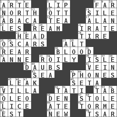 ACROSS 1. Johnson of "Laugh-In" 5. Mouth edge 8. At a great distance 11. Compass direction 13. Baseball player Mel 14. Filth; sediment 15. Phillipine bananalike plant 16. Afternoon social gathering 17. Actor Alda or Thicke 18. French article 19. 480, 500 or 516 sheets of paper 21. Feeling or showing extreme anger 22. Froth on beer 24. Become fatigued 25. Motion picture awards 27. The first octave above the treble staff 29. Rump 30. Vital fluid 32. Singer Murray 33. Agitated, as a liquid 35. Small island 39. Applies to a surface 41. Distinctive style or manner 42. Ocean 43. Gives a jingle 45. Path through which fluid escapes 48. Stalk of a moss capsule 49. Country estate 50. Jacques of French films 52. Keyboard key 55. Butter sub 56. Lair 57. Fur scarf 59. Louse (plural) 60. Had dinner 61. Singer Mel 62. Eastern Standard Time (abbr.) 63. ___ Haven, CT 64. Russian ruler of old DOWN 1. Of or related to the anus 2. Loose flowing garment 3. File 13 4. And so on (abbr.) 5. Globular water bottle used in Asia 6. A distinct part 7. Parent Teacher Assoc. 8. Of or pertaining to a thread or threads 9. Having winglike extensions 10. French philosopher Descartes 12. Ethiopian city, capital of Harari 14. Indian skirt 20. Begley and Asner 21. "Tell ____ the Marines!" 23. Having ears or earlike features 25. Mouth or opening 26. Elected rep. 27. Everything 28. Myrna of the movies 30. Altar cloth linen 31. A piece of turf (Scot.) 33. Regret 34. Chief or king in Benin or Nigeria 36. Elected representatives 37. Whopper 38. Followers of ems 40. "____ silly question..." 43. Pacific Standard Time (abbr.) 44. Robbery 45. Ms. Damita and namesakes 46. Opt 47. _ vera 49. Short-tailed, large-bodied rat 50. False hair 51. Afresh 53. _ mater 54. Fermented drink made from hops 56. One of the 12 tribes of Israel 58. Small child