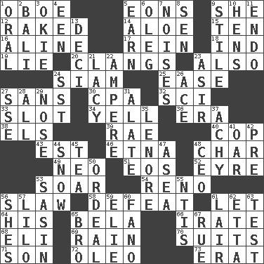 ACROSS 1. Mitch Miller's instrument 5. Immeasurably long periods of time 9. A female animal or person 12. Swept the length of 14. Medicinal plant 15. Nine, plus one 16. Place in a line 17. It's straight from the horse's mouth 18. Working for oneself (abbr.) 19. Falsehood 20. Rings like a ship's bell 23. In addition 24. Thailand, formerly 25. Relaxation 27. Without 30. Accounting whiz (abbr.) 32. _-fi 33. Position in a hierarchy or organization 34. Shout 36. Epoch 38. Raised railways 39. Actress Charlotte 40. Police officer (slang) 43. Eastern Standard Time (abbr.) 46. Inactive volcano in Sicily 48. Burn to charcoal 49. Modern: prefix 51. Greek goddess of the dawn 52. Jane of fiction 53. Fly high 54. Western Nevada city 56. Cole _ (cabbage dish) 58. Outscore 61. Allow 64. Part of HMS, perhaps 65. Actor Lugosi 66. Feeling or showing extreme anger 68. Connecticut Ivy Leaguer 69. Water falling in drops from the sky 70. Sets of matching outer garments 71. Boy, to dad 72. Margarine 73. Part of Q.E.F. DOWN 1. Spoken 2. Indonesian resort city 3. Migrant worker of the '30s 4. Car or cant ending 5. Merit 6. Cassini of fashion 7. Annoying sounds 8. Elected rep. 9. Vertical member of a panel or frame 10. Coop moms 11. Inside; within (prefix) 13. Tenth: prefix 21. Made of lace 22. Electrical Unit 23. SW Saudi Arabia district 24. Fast jet (abbr.) 26. Adept person 27. Compass dir. 28. Everything 29. Sense of smell 31. Having winglike extensions 35. Poe poem 37. Painful 41. Boat paddle 42. Before (prefix) 44. Overwhelm 45. Afternoon social gathering 47. At sea 48. Corporate head (abbr.) 50. Severe or trying experience 53. Indian antelope 55. Nuclear Threat Initiatives 56. "______ My Girl" (Turtles hit) 57. _ and Stitch 59. Writer Wiesel 60. Papal veil 61. Den 62. Singer James 63. Trial 65. Sis' sibling 67. Regret