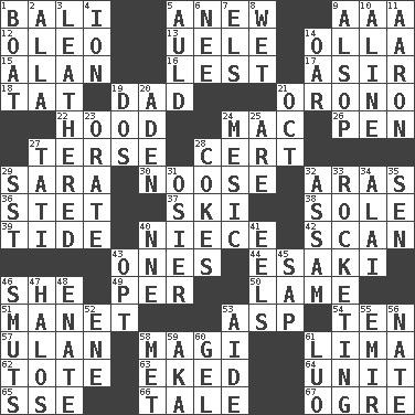 ACROSS 1. Indonesian resort city 5. Afresh 9. American Automobile Association (abbr.) 12. Butter sub 13. Ubangi River tributary 14. Rounded earthenware pot or jar 15. ____ Jay Lerner 16. For fear that 17. SW Saudi Arabia district 18. Make lace 19. June honoree 21. U. of Maine site 22. Parka part 24. Big _ 26. Animal enclosure 27. Laconic 28. Foregone conclusion 29. "Two Mules for Sister ____" 30. Trap for birds or small mammals 32. Ancient river in northeast Turkey 36. Proofreading order 37. What Jean-Claude Killy likes to do 38. Flatfish 39. Event that recurs at intervals 40. Sibling's daughter 42. Examine minutely or intensely 43. Singles 44. 1973 Nobel Price Winner (Physics) Leo 46. A female animal or person 49. For each 50. Unable to walk 51. French painter Edouard 53. Cleo's killer 54. "___ Little Indians" 57. ____ Bator, Mongolia 58. Wise men 61. Pale green bean 62. Carryall 63. Supplemented with great effort 64. A single undivided whole 65. Compass dir. 66. Story 67. Legendary monster DOWN 1. Water vessel 2. Silent film actress Nazimova 3. Tough but pliablecoriaceous 4. Electrically charged atom 5. Old (Scot.) 6. Born 7. Raised railways 8. Dripping 9. Columnist Joseph or Stewart 10. Place in a line 11. Composer Copland 14. Rowing implement 19. Two (Sp.) 20. Arabian gulf 21. Sep. follower 23. Declaim 24. Mesonic 25. "We ___ not amused" (Victoria) 27. Jacques of French films 28. Popular sodas 29. Fast jet (abbr.) 31. Flexible twig of a willow tree 32. Indian state 33. Shooting up abruptly 34. Jai ____ 35. Elected rep. 40. Compass dir. 41. Snakelike fish 43. Choose 45. Plant excrement 46. Particles of soot 47. Saint headwear 48. Maternal 52. Compass dir. 53. Assistant 55. Independent ruler or chieftain 56. Nathan's nickname 58. Was introduced to 59. Alias (abbr.) 60. Set 61. Nilotic language