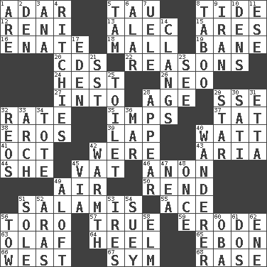 ACROSS 1. The sixth month of the Jewish calendar 5. The 19th letter of the Greek alphabet 8. Event that recurs at intervals 12. Painter Guido (1575-1642) 13. Actor Baldwin 15. Ancient Greek god of war 16. Maternal 18. Shopping center 19. Object of repulsion 20. Music discs 22. Thinks logically 24. Command 26. Modern: prefix 27. To the inside or interior of 28. Mature 29. Compass dir. 32. Assign a rank or rating to 35. Naughty children 37. Make lace 38. Greek god of love 39. Infant locale 40. Electrical Unit 41. Sep. follower 42. We are 43. Roberta Peters solo 44. A female animal or person 45. Large container 46. Soon (poet.) 49. Atmosphere 50. Tear apart 51. Deli grouping 55. Adept person 56. "Corrida" creature 57. Loyal 59. Wear away 63. Norwegian king 64. The bottom of a shoe or boot 65. Inky black, to poets 66. Compass direction 67. Symbol (abbr.) 68. To erase DOWN 1. "We ___ not amused" (Victoria) 2. Lair 3. Santa ___, CA 4. Actors Guy, Robert Welles, and Clint 5. Scottish cap 6. Having or resembling wings 7. Ubangi River tributary 8. Off limits 9. SW Asia republic 10. Cub Scout units 11. Compass dir. 14. Gives out a loud, resonant sound 17. Paradise 21. Fast jet (abbr.) 23. Observe 25. Rest room 28. Become visible 29. Play the lead 30. Suttee (variant) 31. Singer James 32. Vintage cars 33. Bowlike part 34. Carryall 36. Spoil 40. Roamer 42. Heat 45. By way of 47. Teachers' org. 48. Single time 49. High up in or into the air 51. Not divided or shared with others 52. Ancient river in northeast Turkey 53. Angers 54. Chop _ 56. Pull behind 58. Shade tree 60. Chief or king in Benin or Nigeria 61. Two (Sp.) 62. Compass dir.