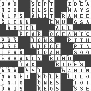 ACROSS 1. Movie disc 4. Back-to-school mo. 8. It may be bright or harebrained 12. River (Sp.) 13. Otherwise 14. Negative votes 15. High mountains 17. Came down and settled, as after flight 18. The wife of a rajah (variant) 19. American astronaut and politician John 21. Australian flightless bird 23. Girls' org. (abbr.) 24. Satellite of Uranus 26. Everything 28. Lightbulb-shaped fruit 30. Pertaining to the sea 34. Tenth month of the Hindu calendar 37. Charged particles 39. Essential or central part 40. Purpose 41. Sibling's daughter 43. Parent Teacher Assoc. 44. Path through which fluid escapes 46. Rich soil 47. "Barney Miller" actor Jack 48. The state or an instance of erring 51. Tall New Zealand timber tree 54. Small boy 55. Amusement-park features 58. Santa ___, CA 61. Fast jet (abbr.) 63. Homeless child 65. French painter Edouard 67. Opening into or through something 71. _ and Stitch 72. To the inside or interior of 73. Singles 74. Small child 75. Raised platform 76. Vintage cars 77. Compass dir. DOWN 1. To be drawn or hauled along 2. Country estate 3. Drug addict 4. Ocean 5. Pipe bend 6. 23rd letter of the Greek alphabet 7. Wig 8. _ tizzy (2 wds.) 9. Mild oath, euphamism for damn 10. Snake ____ (dice throw) 11. Toward the sea 16. Clip 18. Governing power 20. Born 22. Big _ 25. (Had) reclined 27. Infant locale 29. Turbulent 30. Witty Wilde 31. Cuts off 32. "Tell ____ the Marines!" 33. US Secretary of Labor Elaine L. _ 34. Whimper 35. One who uses or employs something 36. Dry up 38. Modern: prefix 42. Independent ruler or chieftain 45. Krazy ___ of comics 49. Political cartoonist Thomas 50. Music discs 52. Russian fighter aircraft 53. Hereditary estate 56. Sends forth 57. Grain storage towers 58. Among 59. Grandmother 60. Against 62. Son of Odin 64. Make mention of 66. Greek goddess of the dawn 68. Single 69. Lion 70. Double-curved letter