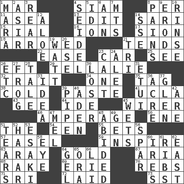 ACROSS 1. Impair 4. Thailand, formerly 8. For each 11. Toward the sea 13. Prepare for publication 14. Indian skirt 15. Monetary unit of Yemen 16. Charged particles 17. The Jewish people; Israel 18. Moved like an arrow 21. Is inclined (to) 22. Relaxation 23. 4-wheeled motor vehicle 25. Perceive with the eye 26. Newt 29. Copy Pinocchio 32. Distinguishing feature 34. Single 35. Label 38. Chilled 39. Thick mixture 41. Southern CA. univ. 43. Unit of force equal to gravity 44. Binary compound 45. One who wires 46. Electrical Measurement 50. Compass dir. 51. Definite Article 54. Car or cant ending 55. Wagers 57. Artist's stand 59. Motivate 63. Like ___ of sunshine 64. Aureate 67. Roberta Peters solo 68. Immoral or dissolute person 69. One of the Great Lakes 70. Confederate soldiers (slang) 71. _ Lanka 72. Put down 73. Fast jet (abbr.) DOWN 1. Hindu Mythology: god of death 2. SW Saudi Arabia district 3. Rump 4. A glass for beer 5. Wedding promise 6. The 18th letter of the Arabic alphabet 7. Mountains (abbr.) 8. Aches 9. Eat (away) 10. Remove soap 12. Medicinal plant 14. Compass dir. 19. Electrical Unit 20. Compass dir. 21. Three (prefix) 23. Patter 24. Toward shelter 26. And so on (abbr.) 27. Tree-dwelling hopper 28. Falsehood 30. Failure 31. Needle case 33. It may be bright or harebrained 36. 1/640 square mile 37. Small, secluded valley 39. Corncob 40. An important port of Yemen 42. "We ___ not amused" (Victoria) 45. Soaks 47. Cartoonist voice _ Blanc 48. Stayed 49. Commissioned mil. rank 51. Pulls into pieces 52. Ethiopian city, capital of Harari 53. 1973 Nobel Price Winner (Physics) Leo 56. Coast Guard woman 58. Sight organ 60. Angers 61. Teases 62. Compass direction 64. Set 65. Mouth or opening 66. Cards in a Roman deck?