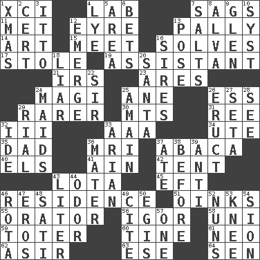 ACROSS 1. One more than ninety 4. Experiment locale 7. Droops 11. Was introduced to 12. Jane of fiction 13. Friendly 14. Tate display 15. Rendezvous 16. Finds the solution 17. Took without asking 19. Aide 21. Big collection agency 23. Ancient Greek god of war 24. Wise men 25. One (Scot) 26. Double-curved letter 29. More valued for its uncommonness 30. Mountains (abbr.) 31. To separate or throw off 32. One more than two 33. American Automobile Association (abbr.) 34. Shoshoni 35. Male parent 36. Medical imaging device (abbr.) 37. Phillipine bananalike plant 40. Raised railways 41. The 18th letter of the Arabic alphabet 42. Portable shelter 43. Globular water bottle used in Asia 45. Lizard (obsolete) 46. Home 51. Pig sounds 55. Speaker 56. Composer Stravinsky 58. University (slang) 59. Carrier 60. Prong on a fork 61. Modern: prefix 62. SW Saudi Arabia district 63. Compass dir. 64. Elected rep. DOWN 1. Dec. holiday 2. Certainty 3. "Tell ____ the Marines!" 4. Potassium hydroxide 5. Type of rug 6. Antes 7. Table seasonings 8. Inventor's middle name 9. Small, secluded valley 10. System (abbr.) 12. Develop 13. Airs 16. Begets 18. One who doesn't tell the truth 20. Before Barbara or Clara 22. Title for a knight 24. Women servants 25. At full speed 26. Spew [out] 27. Stalk of a moss capsule 28. Observe 29. Monetary unit of Yemen 32. Binary compound 33. Believer in; advocate of (suffix) 36. Mother 37. Had dinner 38. Prior to 39. Against 43. 61 cubic inches 44. Scent 46. Roll call or roster of names 47. Greek god of love 48. Suttee (variant) 49. Quote 50. The front part of a cuirass 52. Religious women 53. Leg joint 54. The Jewish people; Israel 57. Single