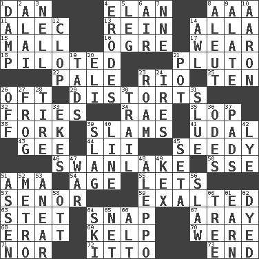 ACROSS 1. One of the 12 tribes of Israel 4. Flair 8. American Automobile Association (abbr.) 11. Actor Baldwin 13. It's straight from the horse's mouth 14. Silent film actress Nazimova 15. Shopping center 16. Legendary monster 17. Put on (as clothing) 18. Manned the helm 21. Mickey's pet 22. Diluted with white 23. _ de Janeiro 25. Nine, plus one 26. Often (poetically) 29. What propaganda does 32. Strips of potato fried in deep fat 34. Actress Charlotte 35. Trim (branches) 38. Tined utensil 39. Shuts with force 41. Freehold land 43. Turn to the right 44. Cards in a Roman deck? 45. Morally degraded 46. Tchaikovsky ballet 50. Compass dir. 51. Nursemaid (var.) 54. Grow older 55. Allows 57. Sir (Sp.) 59. Glorified 63. Proofreading order 64. Fastener 67. Like ___ of sunshine 68. Part of Q.E.F. 69. Seaweed 70. We are 71. And not 72. "Tell ____ the Marines!" 73. Conclude DOWN 1. Moist 2. Jai ____ 3. 1994 drama film starring Jodie Foster 4. Eats (away) 5. Part of a journey 6. Wind 7. Compass dir. 8. Eskimo relative 9. Having winglike extensions 10. Composer Copland 12. Hoof sound 14. Leather borer 19. Bits 20. Biblical high priest 21. Cooking vessel 23. Wander aimlessly 24. Angers 26. Below a satisfactory level 27. Tree-dwelling hopper 28. Hoop that covers a wheel 30. Lag or linger behind 31. Change direction abruptly 33. Makes supply last 36. Lyric poems 37. Writing tablets 39. Volcanic refuse 40. Actor's bit 42. Sodium hydroxide 45. Bristle 47. Armed conflict 48. City in Syria 49. A weed 51. NE Netherlands city 52. Paris' subway 53. Approach 56. Cole _ (cabbage dish) 58. Baseball player Mel 60. Relationship diagram 61. Merit 62. Colored 64. What Jean-Claude Killy likes to do 65. Fish or hair follower 66. Keyboard modifier key