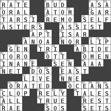 ACROSS 1. Pace 5. Partially opened flower 8. White ___ sheet 11. Of the mouth 12. Tiny particle 14. Slender fish 15. Tarsus (plural) 17. San ____ (Riviera town) 18. Automatically 19. Michaelmas daisies 21. Help 23. Fitting 25. Austrian river, tributary to the Danube 26. Small Philippine buffalo 27. Not either 28. Mouth edge 31. Commissioned mil. rank 33. Three (prefix) 35. Tolerate 37. "Corrida" creature 38. Baseball player Mel 40. Sign of things to come 41. Silly 43. Elected rep. 45. Auto club (abbr.) 46. Fish or hair follower 47. Two (Sp.) 50. 90 degrees 52. Not recorded 53. Compass dir. 54. Declaimed 56. Seas 61. Hoof sound 62. Depend 65. Lies 66. Everything 67. Loyal 68. Take ten 69. Actress Charlotte 70. Mayday 71. Puts into a specified state DOWN 1. Round or rotation of duties 2. Caspian sea tributary 3. Small pie 4. Otherwise 5. Long, evenly shaped piece 6. Shoshoni 7. Kingdom 8. Eras 9. Table seasoning 10. Sandy's bark 13. With motion or animation 16. SW Asia republic 18. Title for a knight 20. Blemish 22. "Two Mules for Sister ____" 24. Pacific island yam 26. Soon (poet.) 28. Pale green bean 29. The content of cognition 30. Animal enclosure 31. Went 32. Part of Q.E.F. 34. It is 36. Water vessel 37. Shallow baking pan 39. Adolescent 42. Prepare for publication 44. Billionth: prefix 48. Unconcealed 49. Spring feasts 51. Religious group 52. Infant locale 54. Spanish pot 55. Hero or heavy, e.g. 57. Hearing organs 58. Toward shelter 59. Egg locale 60. Fast planes 61. 4-wheeled motor vehicle 63. Nilotic language 64. It is so