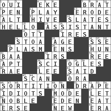 ACROSS 1. Fr. "Yes" 4. Supplement with great effort 7. Naughty child 11. Animal enclosure 12. Frolic 13. Eat (away) 14. The first octave above the treble staff 15. Hub of activity 16. Chalkboards 17. Phone greeting 19. Aide 21. Baseball player Mel 23. Angers 24. Portico 25. Mature 26. Compass dir. 29. Suffix with ecto or cyto 30. Followers of ems 31. Attila the _ 32. Sound made by sheep 33. Big collection agency 34. Portuguese money of account (variant) 35. Fitting 36. _-fi 37. Stares 40. Actress Charlotte 41. Area sheltered from the wind 42. Alleged 43. Glance over 45. Mouth or opening 46. Drawing lots 51. Window treatment 55. Foolish or stupid persons 56. Method 58. Allow 59. Impressive in appearance 60. Paradise 61. Consume 62. Celtic language 63. ___ Haven, CT 64. Period DOWN 1. Brightly colored fish 2. Ubangi River tributary 3. International (abbr.) 4. Connecticut Ivy Leaguer 5. Polynesian shrub of the pepper family 6. Snake ____ (dice throw) 7. Naughty children 8. Round or rotation of duties 9. Arabian gulf 10. Trial 12. Pictures 13. Otherwise 16. Begets 18. Globular water bottle used in Asia 20. Signals 22. Scottish cap 24. Schedule 25. Nest on high 26. Fragment 27. Institutes legal proceedings 28. Compass dir. 29. Dad 32. Tavern 33. Ancient Celtic tribe of eastern Britain 36. Narrow boards 37. Bear (Spanish) 38. Place where plants grow 39. One who doesn't tell the truth 43. Took without asking 44. Quote 46. Trig term 47. Aroma 48. Teases 49. Presage 50. Thickened enlargement 52. Toward shelter 53. Lightbulb-shaped fruit 54. Singer James 57. Morning condensation