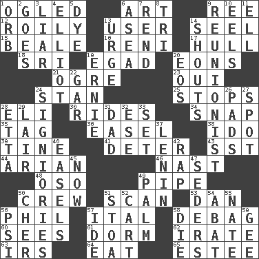 ACROSS 1. Stared 6. Nonscientific branch of learning 9. To sift 12. Turbulent 13. One who uses or employs something 14. Sew up the eyelids of hawks and falcons 15. Memphis, Tenn. Street 16. Painter Guido (1575-1642) 17. Frame or body of a ship 18. Indian title of respect (Mr.) 19. Mild oath 20. Immeasurably long periods of time 21. Legendary monster 23. Fr. "Yes" 24. Comedian Laurel of Laurel & Hardy 25. Halts 28. Connecticut Ivy Leaguer 30. Amusement-park features 34. Fastener 35. Label 36. Artist's stand 38. Wedding promise 39. Prong on a fork 41. Prevent from occurring 43. Fast jet (abbr.) 44. Believer in; advocate of (suffix) 46. Political cartoonist Thomas 48. Bear (Spanish) 49. Corncob 50. Group working together 51. Glance over 53. Daniel's nick name 56. Silvers or Donahue 57. Slanted text style (abbr.) 58. Debunk (Brit. slang) 60. Observes 61. Dormintory (informal) 62. Feeling or showing extreme anger 63. Big collection agency 64. Erode 65. First name in cosmetics DOWN 1. Globe 2. Moves 3. One who doesn't tell the truth 4. American author Paul (1891-1958) 5. Color 6. At sea 7. Tear apart 8. Three (prefix) 9. One who advocates reunion 10. Snakelike fish 11. Pipe bend 13. Goad 14. Yells 19. Bert's buddy 20. Greek goddess of the dawn 22. Slender fish 24. Seigniories (variant) 26. Writing tablets 27. Specific locale 28. Singer James 29. Den 31. June honoree 32. Compass dir. 33. Arrange properly for use 37. Soviet premier 1918-24 40. Artist's stands 42. Hit sharply and swiftly 45. At this time 47. Spring feasts 49. Inside of hand 50. "Mermaids" star 51. Portico 52. Draw slowly or heavily 54. Blind as ____ 55. Nathan's nickname 56. Air pressure measure (abbr.) 57. Binary compound 58. Expire 59. Unit of force equal to gravity