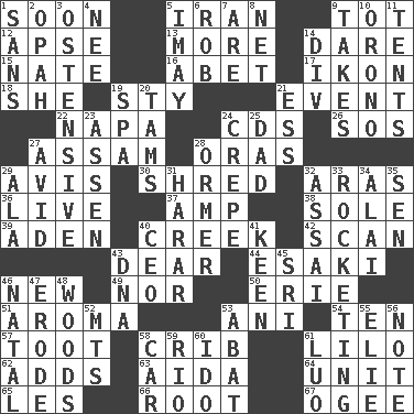 ACROSS 1. Within a short period 5. SW Asia republic 9. Small child 12. Domed church section 13. Greater amount 14. Have the gumption 15. Nathan's nickname 16. Collude with 17. Picture 18. A female animal or person 19. Filthy place 21. Happening 22. California wine valley 24. Music discs 26. Distress signal 27. Indian state 28. Mouths or openings 29. Advice 30. Tear up 32. Ancient river in northeast Turkey 36. Not recorded 37. Electrical Unit 38. Not divided or shared with others 39. Arabian gulf 40. Small stream 42. Examine hastily 43. Letter starter 44. 1973 Nobel Price Winner (Physics) Leo 46. ___ Haven, CT 49. Or not 50. One of the Great Lakes 51. Odor 53. Cuckoo 54. Nine, plus one 57. A blast of a horn 58. Baby bed with high sides 61. _ and Stitch 62. Sums up 63. Opera by Verdi 64. A single undivided whole 65. French article 66. Carrot, for example 67. Double curve, resembling the letter S DOWN 1. Without 2. Brightly colored fish 3. Clearly or manifestly demonstrative 4. Born 5. "If ____ say so..." 6. Director Reiner 7. "We ___ not amused" (Victoria) 8. Fish or hair follower 9. Proceeds 10. U. of Maine site 11. Portable shelters 14. HTML Container Element 19. Health resort 20. Scottish caps 21. Double-curved letter 23. NE Netherlands city 24. Streamer paper 25. Male parent 27. Enthusiastic 28. Channel Islands abalone 29. Wing 31. Ethiopian city, capital of Harari 32. Slender Brazilian palm 33. Shooting up abruptly 34. Jai _ 35. Elected rep. 40. Corporate head (abbr.) 41. Peachy ____! 43. Heredity factor (abbr.) 45. Indian title of respect (Mr.) 46. Relating to or accompanying birth 47. Eat (away) 48. Forest 52. Mountains (abbr.) 53. Blind as ____ 55. Writer Wiesel 56. Observe 58. 4-wheeled motor vehicle 59. _ de Janeiro 60. Wedding promise 61. Nilotic language