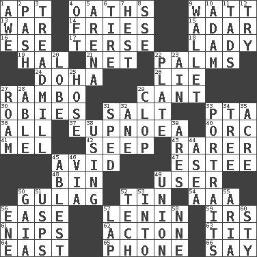 ACROSS 1. Fitting 4. Profane or obscene expressions 9. Electrical Unit 13. Armed conflict 14. Strips of potato fried in deep fat 15. The sixth month of the Jewish calendar 16. Compass dir. 17. Laconic 18. Kenny Rogers chart-topper in '80 19. Actor Linden 21. Fish or hair follower 22. Insides of hands 24. Capital of the state of Qatar 26. Untruth 27. Role for Stallone 29. Patter 30. Off-Broadway awards 31. Table seasoning 33. Parent Teacher Assoc. 36. 100% 37. Normal relaxed breathing 40. The grampus (Milton) 41. Cartoonist voice _ Blanc 42. Ooze 43. Less widely known 45. Enthusiastic 47. First name in cosmetics 48. Storage container 49. One who makes use of a thing 50. POW camp 52. Shallow baking pan 54. American Automobile Association (abbr.) 56. Relaxation 57. Soviet premier 1918-24 59. Big collection agency 61. Pinches, bites 62. 13-14th century defensive garment 63. Teat (slang) 64. 90 degrees 65. Give a jingle 66. Declare DOWN 1. Deep reverence 2. Romantic infatuation 3. Excercise machine 4. Often (poetically) 5. Sports stadium 6. Hoop that covers a wheel 7. Behest 8. Compass dir. 9. Place for singles 10. First of billions? 11. Small amounts or degrees 12. Attempt 20. Ear part 22. Food holder 23. The 18th letter of the Arabic alphabet 25. Stockings 27. Wander 28. Competent 29. Hoof sound 31. Drove too fast 32. One (Scot) 33. Likenesses of persons 34. Relationship diagram 35. Land measure 38. Putting into practice 39. Ancient Greek god of war 44. Toward the sea 45. Most capable 46. By way of 49. The state of being joined or united 50. Greek goddess of the earth (variant) 51. United States Postal Service (abbr.) 52. Technical work 53. To the inside or interior of 55. Operatic vocal solo 56. Compass dir. 57. Pet locale 58. Compass dir. 60. Filthy place