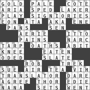 ACROSS 1. Precious metal 5. Light colored 9. ____ d'Azur (French Riviera) 13. Roberta Peters solo 14. Drove too fast 15. Member of a famous L.A. basketball team 16. Frolic 17. Seigniories (variant) 19. Period of immesurable duration 20. "One Day ___ Time" 21. Alias (abbr.) 22. Compass dir. 23. Baking dishes 25. Elected rep. 26. Nest on high 30. "Tell ____ the Marines!" 34. Aches 35. Drug cop 36. Canvas cover 39. Profane or obscene expressions 42. "This won't hurt ____!" 43. Leg joint 44. Ingested 46. Wrote a lyric poem 47. Schedule 48. Director Reiner 51. Long journey 54. Institute legal proceedings 57. Wind 58. Afternoon social gathering 60. Zeal 62. Interpreter 65. Have the gumption 66. Match 67. Son of Odin 68. Singer Brickell 69. Grandmother 70. Arranges properly for use 71. Gone DOWN 1. Stare wonderingly 2. Lowest deck of a ship 3. Climbing, woody, usually tropical vines 4. 24 hours 5. Inconspicuous attention getter 6. Capital of Western Samoa 7. Part of a journey 8. Ferber et al. 9. Auto 10. Migrant worker of the '30s 11. Adolescent 12. Celtic language 15. Grant temporary use of 18. Eisenhower's nickname 20. At sea 24. Slept 27. River (Sp.) 28. _ tizzy (2 wds.) 29. _____ Park, CO 30. More lacking in sense or substance 31. Bar bill 32. Three (prefix) 33. Sep. follower 36. Ring climax 37. Added to 38. Portuguese money of account (variant) 40. Actor Linden 41. R.R. building 45. Singer James 48. Raze (variant) 49. Petroleum 50. Naughty children 52. Dodge 53. Japanese brewing company 54. Comedian Laurel of Laurel & Hardy 55. Capital and largest city of Mongolia 56. Merit 58. A blast of a horn 59. Blunders 61. Confront 63. Teachers' org. 64. Definite Article 65. Morning condensation