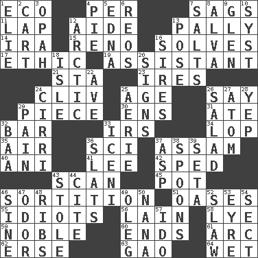 ACROSS 1. Environmental prefix 4. For each 7. Sinks 11. Pet locale 12. Assistant 13. Friendly 14. Retirement account (abbr.) 15. Western Nevada city 16. Finds the solution 17. Value system 19. Helper 21. R.R. building 23. Angers 24. 154 in Roman numerals 25. Mature 26. Declare 29. Part 30. Followers of ems 31. Had dinner 32. Drinking establishment 33. Big collection agency 34. Chop off 35. Wind 36. _-fi 37. Indian state 40. Cuckoo 41. Area sheltered from the wind 42. Hurried 43. Examine hastily 45. Cooking vessel 46. Drawing lots 51. Fertile tracts in a desert 55. Foolish or stupid persons 56. (Had) reclined 58. Sodium hydroxide 59. Impressive in appearance 60. Extremities 61. Curve 62. Celtic language 63. E Mali city 64. Soggy DOWN 1. Writer Wiesel 2. Haul 3. Brightly colored fish 4. Sliced dessert 5. Pulitzer Prize-winning author Ferber 6. Vintage cars 7. Table seasonings 8. Inventor's middle name 9. Small, secluded valley 10. System (abbr.) 12. Northern region 13. Airs 16. Begets 18. Small island 20. Public displays of written messages 22. "___ Maria" 24. High-altitude cloud 25. Nest on high 26. Vegetable dish 27. Tiny particle 28. Slangy assent 29. Ache 32. Sound made by sheep 33. Ancient Celtic tribe of eastern Britain 36. Narrow boards 37. Cleo's killer 38. Soup utensils 39. Bristle 43. Took without asking 44. Quote 46. Trig term 47. Aroma 48. Chest bones 49. Cassini of fashion 50. Nanny 52. Cole _ (cabbage dish) 53. Jane of fiction 54. Religious group 57. Wedding promise