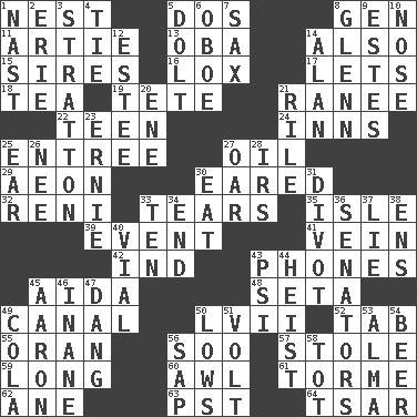 ACROSS 1. Egg locale 5. Two (Sp.) 8. Commissioned mil. rank 11. Nick name for Arthur 13. Chief or king in Benin or Nigeria 14. In addition 15. Begets 16. Brine-cured salmon 17. Allows 18. Afternoon social gathering 19. False hair 21. Indian princess (variant) 22. Adolescent 24. Taverns 25. Main course 27. Lubricate 29. A really long time 30. Having ears or earlike features 32. Painter Guido (1575-1642) 33. Pulls into pieces 35. Small island 39. Happening 41. Distinctive style or manner 42. Working for oneself (abbr.) 43. Gives a jingle 45. Opera by Verdi 48. Bristle 49. Lessep's creation 50. 57 in ancient Rome 52. Bar bill 55. Northwest Algerian city 56. "Barney Miller" actor Jack 57. Fur scarf 59. Having great length 60. Leather borer 61. Singer Mel 62. A saturated hydrocarbon 63. Pacific Standard Time (abbr.) 64. Russian ruler of old DOWN 1. Political cartoonist Thomas 2. One of the Great Lakes 3. Ski resort town in Vermont 4. Standoff 5. Stupid person 6. Mitch Miller's instrument 7. Saxophone 8. American astronaut and politician John 9. _____ Park, CO 10. Characteristic smell of wine 12. First name in cosmetics 14. Actor Alda or Thicke 20. Compass dir. 21. Cause heat under the collar 23. Bert's buddy 25. Ewer handle 26. Born 27. Boat paddle 28. Big collection agency 30. Erode 31. A piece of turf (Scot.) 33. "___ Little Indians" 34. Conclusion 36. Legislators 37. Untruth 38. Followers of ems 40. Small bottle 43. 23rd letter of the Greek alphabet 44. Robbery 45. Composer Copland 46. Lacking in sense or substance 47. Mild oath, euphamism for damn 49. Root beer relative 50. Moos 51. Electrical Unit 53. _ mater 54. Fermented drink made from hops 56. Plant excrement 58. Small child