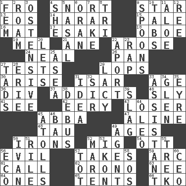 ACROSS 1. From 4. Derisive sound 9. Play the lead 13. Greek goddess of the dawn 14. Ethiopian city, capital of Harari 15. Diluted with white 16. Floor covering 17. 1973 Nobel Price Winner (Physics) Leo 18. Mitch Miller's instrument 19. Cartoonist voice _ Blanc 21. One (Scot) 22. Came up 24. Anneal 26. Baking dish 27. Trials 29. Chops off 30. Originate 31. Austrian river, tributary to the Danube 33. Ripen 36. HTML Container Element 37. Inveterate users 40. Cunning 41. Observe 42. Suggestive of the supernatural 43. Failure 45. Swedish rock group 47. Place in a line 48. The 19th letter of the Greek alphabet 49. Matures 50. Removes the wrinkles 52. Russian fighter aircraft 54. Baseball player Mel 56. Morally bad or wrong 57. Receives possession of 59. Curve 61. Give a ring to 62. U. of Maine site 63. Born 64. Singles 65. Portable shelters 66. Ring climax DOWN 1. Opposite of masc. 2. Wander 3. Clearly or manifestly demonstrative 4. A female animal or person 5. Rhinal 6. Northwest Algerian city 7. Immoral or dissolute person 8. Three (prefix) 9. Soup utensils 10. Bar bills 11. Medicinal plant 12. To sift 20. Allows 22. To the left, to Queeg 23. Reproach for some lapse or misdeed 25. Toward the sea 27. Bits 28. One of the Great Lakes 29. Made of lace 31. The content of cognition 32. Title for a knight 33. Aide 34. Small, secluded valley 35. Jane of fiction 38. Alight from a bus 39. Volcanic refuse 44. Margarine 45. Ringlike coral islands and reefs 46. Bar 49. Representative 50. _ the terrible 51. Cause heat under the collar 52. Female horse 53. Picture 55. Long journey 56. Environmental prefix 57. Small child 58. Distress signal 60. Corporate head (abbr.)