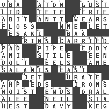 ACROSS 1. Chief or king in Benin or Nigeria 4. Tiny particle 8. Abrupt rush of wind 12. Hat (slang) 13. Wig 14. 4th largest of the Great Lakes 15. "This won't hurt ____!" 17. Against 18. Erodes 19. Soft thread for cleaning between teeth 21. Compass dir. 23. Allow 24. 1973 Nobel Price Winner (Physics) Leo 26. Sound made by sheep 28. Basketball hoops 30. Borne 34. Writing tablet 37. Corncob 39. Whirlpool 40. Black tropical American cuckoo 41. Vertical member of a panel or frame 43. Car or cant ending 44. Stupid person 46. Snakelike fish 47. One (Scot) 48. Deli grouping 51. Compass direction 54. _ stream 55. A salt of uric acid 58. Electrical Unit 61. Begley and Asner 63. Removes the wrinkles 65. Wet 67. Conclusions 71. Of the mouth 72. Toward shelter 73. Famous astronaut Armstrong 74. R.R. building 75. Command 76. _ Jones' Locker 77. Barrel DOWN 1. Norwegian king 2. God's Word 3. Goodbye (Sp.) 4. "One Day ___ Time" 5. "___ Little Indians" 6. Baseball player Mel 7. Count _ (2 wds.) 8. Turn to the right 9. Mountain range 10. The founder of a family 11. Trial 16. Russian ruler of old 18. Erode 20. What Jean-Claude Killy likes to do 22. Basketball assoc. 25. Naughty children 27. "We ___ not amused" (Victoria) 29. Settings 30. Cell (Danish) 31. The main thing one is thinking about 32. Paradise 33. Unit of force 34. Writing tablets 35. Small Philippine buffalo 36. Deli pickle 38. Sliced dessert 42. He sold his birthright 45. _ Mahal 49. Confront 50. It would 52. _ Lanka 53. Edible starchy tuberous root 56. Cod relative 57. Maternal 58. Nursemaid 59. Undercover agent 60. Sliced desserts 62. Transmit 64. Volcanic refuse 66. Put into a specified state 68. Teachers' org. 69. HTML Container Element 70. Roguish