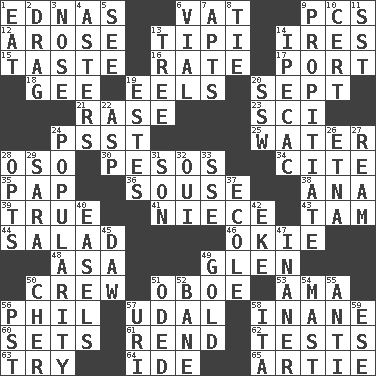 ACROSS 1. Ferber et al. 6. Large container 9. Personal Computers (abbr.) 12. Came up 13. Native american tent (variation) 14. Angers 15. Clothes sense 16. Assign a rank or rating to 17. Left side of a ship or aircraft 18. Turn to the right 19. Snakelike fish 20. Back-to-school mo. 21. To erase 23. _-fi 24. Inconspicuous attention getter 25. Wetness 28. Bear (Spanish) 30. Mexican monetary units 34. Quote 35. Infant food 36. Lush 38. Santa ___, CA 39. Loyal 41. Sibling's daughter 43. Scottish cap 44. Vegetable dish 46. Migrant worker of the '30s 48. White ___ sheet 49. Small, secluded valley 50. Ship's personnel 51. Mitch Miller's instrument 53. Nursemaid (var.) 56. Silvers or Donahue 57. Allodial 58. Lacking in sense or substance 60. Puts into a specified state 61. Tear apart 62. Trials 63. Attempt 64. Binary compound 65. Nick name for Arthur DOWN 1. Consume 2. To trail on the ground 3. Characteristic smell of wine 4. Michaelmas daisies 5. Perceive with the eye 6. Small bottle 7. Tenement units (abbr.) 8. Neckwear 9. Appease 10. Sure thing 11. Fast jet (abbr.) 13. Family _ (genealogy) 14. Medicinal drug used to evoke vomiting 19. _____ Park, CO 20. Compass dir. 22. Viper 24. Teen's desire 26. Inactive volcano in Sicily 27. 480, 500 or 516 sheets of paper 28. Chooses 29. "Two Mules for Sister ____" 31. Male offspring 32. Fr. "Yes" 33. Compass dir. 37. Learning spot: Fr. 40. Artist's stands 42. Make supply last 45. Simpleton 47. More lacking in sense or substance 49. Gilt 50. "Mermaids" star 51. Wrote a lyric poem 52. Object of repulsion 54. Vertical spar for supporting sails 55. Opposed to 56. Pacific Standard Time (abbr.) 57. RI univ. 58. Call ___ day 59. Compass dir.
