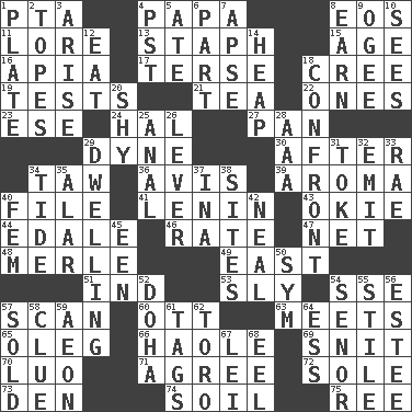 ACROSS 1. Parent Teacher Assoc. 4. Dad 8. Greek goddess of the dawn 11. Old wives' tales, e.g. 13. Staphylococcus 15. Ripen 16. Capital of Western Samoa 17. Laconic 18. Algonquian 19. Trials 21. Afternoon social gathering 22. Singles 23. Compass dir. 24. Actor Linden 27. Baking dish 29. Centimeter-gram-second unit of force 30. Following 34. The 23rd letter of the Hebrew alphabet 36. Deliberation 39. Odor 40. Do some clerical work 41. Soviet premier 1918-24 43. Migrant worker of the '30s 44. Peak District village in England 46. Pace 47. Fish or hair follower 48. Haggard of country music 49. Compass direction 51. Working for oneself (abbr.) 53. Insidious 54. Compass dir. 57. Examine hastily 60. Baseball player Mel 63. Confronts 65. Cassini of fashion 66. White Person, in Hawaii 69. In a ____ (agitated or irritated) 70. Nilotic language 71. Match 72. Flatfish 73. Lair 74. Earth 75. Portuguese money of account (variant) DOWN 1. Food holder 2. Drinks excessively 3. Ascend 4. Pacific Standard Time (abbr.) 5. Had dinner 6. Role in a play 7. Domed church section 8. Merit 9. Double curve, resembling the letter S 10. Observes 12. Consume 14. Pile 18. Meet 20. Like a shrinking violet 25. Of or related to the anus 26. Crowbar 28. Auto club (abbr.) 29. Residence 31. Puff or smoke 32. Send forth 33. Actress Charlotte 34. Event that recurs at intervals 35. Having or resembling wings 37. _ tizzy (2 wds.) 38. Settings 40. Opposite of masc. 42. Actress Patricia 45. Car or cant ending 50. Symbol (abbr.) 52. Capital of the state of Qatar 54. Sir (Sp.) 55. Vertical member of a panel or frame 56. First name in cosmetics 57. Exchanged or delivered for money 58. A slight indication 59. A really long time 61. Labels 62. "Corrida" creature 64. Curvy letter 67. Flowery wreath 68. Snakelike fish
