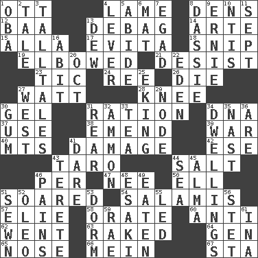 ACROSS 1. Baseball player Mel 4. Unable to walk 8. Habitations of wild animals 12. Sound made by sheep 13. Debunk (Brit. slang) 14. Johnson of "Laugh-In" 15. Silent film actress Nazimova 17. Webber/Rice musical 18. Sever or remove by pinching or nipping 19. Turned at an angle; bent 21. Stop 23. Nervous spasm 24. To riddle 26. Expire 27. Electrical Unit 28. Leg joint 30. Set 31. Food allowance for one day 34. Heredity factor (abbr.) 37. Purpose 38. Make improvements or corrections to 39. Armed conflict 40. Mountains (abbr.) 41. Break 42. Compass dir. 43. Edible starchy tuberous root 44. Table seasoning 46. For each 47. Born 50. Pipe bend 51. Flew 54. Deli grouping 57. Writer Wiesel 58. Speak pompously 60. Opposed to 62. Gone 63. Moved through 64. Commissioned mil. rank 65. Olfactory organ 66. Count _ (2 wds.) 67. R.R. building DOWN 1. Chief or king in Benin or Nigeria 2. Lie 3. Baron Munchausen's specialties 4. Prying instrument 5. Remain 6. Floor protector 7. Mild oath 8. Small ungulate mammals of Africa 9. Bert's buddy 10. Nuclear Threat Initiatives 11. Back-to-school mo. 13. Morning condensation 16. "This won't hurt ____!" 20. Sep. follower 22. Genesis locale 25. Supplementing with great effort 27. 270 degrees 29. Thickened enlargement 30. Chewing product 31. Rump 32. ID or VA city 33. Beverage made from leaves 34. Homes 35. Political cartoonist Thomas 36. "We ___ not amused" (Victoria) 41. Have the gumption 43. Cylindrical with tapered ends 44. Ocean 45. _ mater 46. Aches 48. 1973 Nobel Price Winner (Physics) Leo 49. Consumed 51. Stitched 52. Margarine 53. Dormintory (informal) 55. Directed 56. Proofreading order 59. Actress Charlotte 61. _ tizzy (2 wds.)