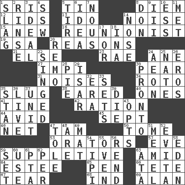 ACROSS 1. Indian titles of respect 5. Shallow baking pan 8. South Vietnam president (1954) 12. Hats (slang) 13. Wedding promise 14. Annoying sound 15. Afresh 16. One who advocates reunion 19. Girls' org. (abbr.) 20. Thinks logically 21. Otherwise 23. Actress Charlotte 24. One (Scot) 27. Body of Kaffir warriors 30. Lightbulb-shaped fruit 31. Annoying sounds 34. Printing process, for short 35. A hard, heavy blow 38. Having ears or earlike features 40. Singles 41. Prong on a fork 42. Food allowance for one day 44. Enthusiastic 45. Back-to-school mo. 46. Fish or hair follower 47. Scottish cap 50. Heavy book 53. Speakers 57. First lady 59. Supplementary 63. Among 64. First name in cosmetics 65. Writing instrument 66. Wig 67. Lacerate 68. Indiana (abbr.) 69. Actor Alda or Thicke DOWN 1. Volcanic refuse 2. Remove soap 3. Perfect 4. Compass dir. 5. Hoop that covers a wheel 6. It may be bright or harebrained 7. Good sense 8. Spanish title 9. One more than two 10. Curvy letter 11. Was introduced to 14. Sense of smell 17. Not either 18. _ tizzy (2 wds.) 20. San ____ (Riviera town) 22. Burned superficially 24. Period of immesurable duration 25. Nathan's nickname 26. Greek god of love 28. Sliced dessert 29. Austrian river, tributary to the Danube 30. Right away 32. Period 33. Arranges properly for use 35. Comedian Laurel of Laurel & Hardy 36. Not recorded 37. A single undivided whole 39. Expire 43. Chooses 47. Lacquered or enameled metalware 48. "We ___ not amused" (Victoria) 49. Floor protector 51. Klaipeda city 52. Webber/Rice musical 54. Native american tent (variation) 55. Baking chamber 56. Tear apart 58. Locale of original sin 59. Put into a specified state 60. Purpose 61. Parent Teacher Association (abbr.) 62. For each 63. _ moment's notice (2 wds.)