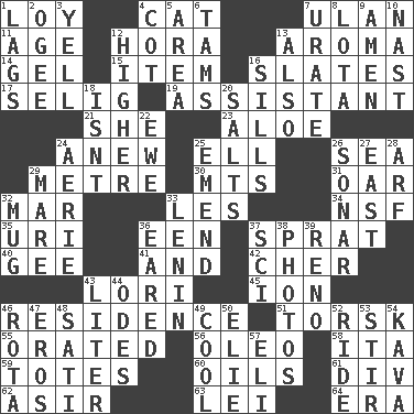ACROSS 1. Myrna of the movies 4. Domesticated feline 7. ____ Bator, Mongolia 11. Ripen 12. Israeli folk dance 13. Scent 14. Set 15. A distinct part 16. Chalkboards 17. Former Milwaukee Brewers owner Bud 19. Helper 21. A female animal or person 23. Medicinal plant 24. Afresh 25. Pipe bend 26. Ocean 29. Distance measurement (Brit.) 30. Mountains (abbr.) 31. Boat paddle 32. Make imperfect 33. French article 34. Overdraft (abbr.) 35. RI univ. 36. Car or cant ending 37. Small fatty European fish 40. Unit of force equal to gravity 41. Plus 42. "Mermaids" star 43. Australian parrot (variant) 45. Electrically charged atom 46. Home 51. Cod relative 55. Declaimed 56. Margarine 58. Call ___ day 59. Lugs 60. Lubricates 61. HTML Container Element 62. SW Saudi Arabia district 63. Flowery wreath 64. Epoch DOWN 1. Straggles 2. Double curve, resembling the letter S 3. Shout 4. Small bed 5. Length times width 6. Scottish caps 7. A salt of uric acid 8. Globular water bottle used in Asia 9. So be it 10. Political cartoonist Thomas 12. Having greater elevation 13. In addition 16. Beverly of Met fame 18. Is not 20. Table seasonings 22. She-sheep 24. Nest on high 25. Make improvements or corrections to 26. Echolocation 27. Compass direction 28. Sandy's bark 29. Female horse 32. Java container 33. Soviet premier 1918-24 36. Having ears or earlike features 37. _-fi 38. Pictures 39. Former U.S. Attorney General Janet 43. 61 cubic inches 44. Lyric poems 46. Round or rotation of duties 47. Greek god of love 48. Suttee (variant) 49. Calm and collected 50. Writer Wiesel 52. Travel on or in a vehicle 53. Move through with a circular motion 54. Polynesian shrub of the pepper family 57. Connecticut Ivy Leaguer