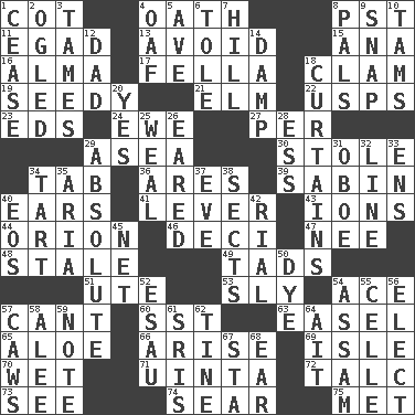 ACROSS 1. Small bed 4. Pledge 8. Pacific Standard Time (abbr.) 11. Mild oath 13. Keep away from 15. Santa ___, CA 16. _ mater 17. Chap (slang) 18. Dollar (slang) 19. Full of seeds 21. Shade tree 22. United States Postal Service (abbr.) 23. Begley and Asner 24. She-sheep 27. For each 29. At sea 30. Fur scarf 34. Keyboard key 36. Ancient Greek god of war 39. Unit of acoustic absorption 40. Hearing organs 41. Crowbar 43. Charged particles 44. Constellation of myth 46. Tenth: prefix 47. Born 48. Lacking originality or spontaneity 49. Small amounts or degrees 51. Shoshoni 53. Insidious 54. Adept person 57. Patter 60. Fast jet (abbr.) 63. Artist's stand 65. Medicinal plant 66. Get up 69. Small island 70. Soggy 71. National forest in Provo, Utah 72. Baby powder 73. Perceive with the eye 74. Wither 75. Was introduced to DOWN 1. Desist 2. Stared 3. Softens 4. Clumsy lout 5. "___ Maria" 6. Lacquered or enameled metalware 7. Land elevation 8. Friends 9. Fastener 10. Scottish caps 12. June honoree 14. Moist 18. Window treatments 20. Affirmative reply 25. Welt 26. Having ears or earlike features 28. Curvy letter 29. Utter; complete 31. Mitch Miller's instrument 32. Actor's bit 33. Followers of ems 34. Small pie 35. Operatic vocal solo 37. Night before a holiday 38. Religious groups 40. Greek goddess of the dawn 42. Monetary unit of Yemen 45. Fish or hair follower 50. Color 52. Son of Isaac 54. Indian state 55. Cell (Danish) 56. Opt 57. Crow sounds 58. Toward shelter 59. Musical sound 61. Indian titles of respect 62. Prong on a fork 64. Small island 67. R.R. building 68. Hearing organ