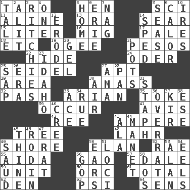 ACROSS 1. Pacific island yam 5. Layer 8. _-fi 11. Place in a line 13. Mouth or opening 14. Burn superficially 15. 61 cubic inches 16. Russian fighter aircraft 17. Diluted with white 18. And so on (abbr.) 19. Double curve, resembling the letter S 21. Mexican monetary units 22. Flintstone garb 24. River in Europe 25. A glass for beer 27. Fitting 29. Length times width 30. Collect or gather 32. Romantic infatuation 33. Believer in; advocate of (suffix) 35. Puff or smoke 39. Happen 41. Deliberation 42. To separate or throw off 43. Electrical Unit 45. Family _ (genealogy) 48. Cowardly lion portrayer 49. Dinah or Pauly 50. Style 52. Actress Charlotte 55. Opera by Verdi 56. E Mali city 57. Peak District village in England 59. A single undivided whole 60. The grampus (Milton) 61. "_____ Recall" 62. Lair 63. 23rd letter of the Greek alphabet 64. Elected reps. DOWN 1. Lie 2. Came down and settled, as after flight 3. Actors Guy, Robert Welles, and Clint 4. Single 5. Residence 6. 4th largest of the Great Lakes 7. Tired old horse 8. Gospel singer Marvin 9. Bodily heat indicating an inflammation 10. Angers 12. Wear away 14. Broke a traffic law 20. Set 21. Plant holders 23. Potato state 25. Plant excrement 26. Epoch 27. Wet nurse (var.) 28. Baking dish 30. Atmosphere 31. Staphylococcus 33. Adept person 34. Sorrow 36. Make much ado about nothing 37. Apertif with cassis 38. Compass dir. 40. Algonquian 43. According to 44. French painter Edouard 45. One or ones belonging to thee 46. "The Thinker" sculptor 47. Part of Q.E.F. 49. Saudi Arabian king (1953-1964) 50. Hearing organs 51. Venues 53. Actor Alda or Thicke 54. Snakelike fish 56. Grand Old Party 58. Two (Sp.)