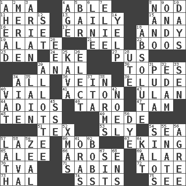 ACROSS 1. Nanny (var.) 4. Competent 8. Lower and raise head in agreement 11. Possessive pronoun 13. Lightheartedly 15. Santa ___, CA 16. One of the Great Lakes 17. Bert's buddy 18. "60 Minutes" Commentator Rooney 19. Having winglike extensions 21. Snakelike fish 22. Expressions of contempt or scorn 23. Lair 24. Supplement with great effort 27. Suppuration 29. Of or related to the anus 30. Drinks excessively 34. 100% 36. Distinctive style or manner 39. Dodge 40. Small bottle 41. 13-14th century defensive garment 43. ____ Bator 44. Goodbye (Sp.) 46. Edible starchy tuberous root 47. Scottish cap 48. Portable shelters 49. Ancient Persian 51. John Ritter's dad 53. Wily 54. Ocean 57. Goldbrick 60. Disorderly crowd 63. Supplementing with great effort 65. Toward shelter 66. Came up 69. Having or resembling wings 70. Federal power corp. 71. Unit of acoustic absorption 72. Haul 73. Actor Linden 74. Fast planes 75. Observe DOWN 1. Toward the future 2. Haggard of country music 3. Believer in; advocate of (suffix) 4. Personal question 5. Oblong piece of solid material 6. Actor's bit 7. Writer Wiesel 8. Billionth: prefix 9. Southwest Nigerian state 10. 24-hour periods 12. Put into a specified state 14. Sharp bark 18. Utter; complete 20. Car or cant ending 25. Polynesian shrub of the pepper family 26. Choose 28. Shoshoni 29. One to whom something is allotted 31. Monetary unit of Botswana 32. Dutch treat 33. Elected rep. 34. Helper 35. (Had) reclined 37. Call ___ day 38. Typical standards 40. Large container 42. Christmas carol 45. Compass dir. 50. Color 52. Dec. holiday 54. Grain storage towers 55. Related on the mother's side 56. Match 57. Thin strip of wood or metal 58. Inventor's middle name 59. Ardor 61. Mouths or openings 62. Moves up and down 64. Krazy ___ of comics 67. Be seated 68. Followers of ems