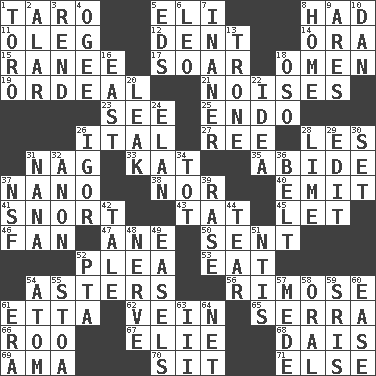 ACROSS 1. Edible starchy tuberous root 5. Biblical high priest 8. Possessed 11. Cassini of fashion 12. Gouge 14. Mouth or opening 15. Indian princess (variant) 17. Fly high 18. Sign of things to come 19. Severe or trying experience 21. Annoying sounds 23. Observe 25. Inside; within (prefix) 26. Slanted text style (abbr.) 27. To riddle 28. French article 31. Tired old horse 33. Krazy ___ of comics 35. Remain 37. Billionth: prefix 38. Not either 40. Send forth 41. Derisive sound 43. Make lace 45. Allow 46. Avid follower 47. One (Scot) 50. Posted 52. Entreaty 53. Ingest 54. Michaelmas daisies 56. Full of chinks, cracks, or crevices 61. Singer James 62. Distinctive style or manner 65. Spanish missionary in California 66. Friend of Pooh 67. Writer Wiesel 68. Raised platform 69. Wet nurse (var.) 70. Be seated 71. Otherwise DOWN 1. "Corrida" creature 2. Having or resembling wings 3. Tear apart 4. Double curve, resembling the letter S 5. Begley and Asner 6. Lion 7. More lacking in sense or substance 8. Residence 9. Ancient Greek god of war 10. Daniel's nick name 13. Heavy duty weighing machine 16. Compass direction 18. Bear (Spanish) 20. Path through which fluid escapes 22. The main thing one is thinking about 24. Liveliness 26. Composer Stravinsky 28. Welles in "The Third Man" 29. Prepare for publication 30. Arrange properly for use 31. Nanny 32. At once, immediately (arch.) 34. Small child 36. Waist strap 37. Science/research agcy. 39. To erase 42. Story 44. Pull apart 48. Impudent aggressiveness 49. Artist's stands 51. Nuclear Threat Initiatives 52. Parent Teacher Association (abbr.) 54. Tiny particle 55. Portico 57. Ancient Persian 58. Spoken 59. Indian titles of respect 60. Comfort 61. Period 63. One more than two 64. Fish or hair follower