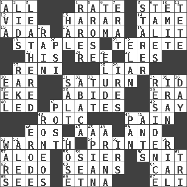 ACROSS 1. 100% 4. Pace 8. Proofreading order 12. Compete 13. Ethiopian city, capital of Harari 14. Docile 15. The sixth month of the Jewish calendar 17. Scent 18. Set down 19. Paper fasteners 21. Cigar-shaped 23. Part of HMS, perhaps 24. To separate or throw off 26. French article 27. Painter Guido (1575-1642) 28. One who doesn't tell the truth 30. Hearing organ 31. Titan orbits this 34. To free from 37. Make supply last 38. Stay 39. Period 40. Directed 41. Food holders 42. Declare 43. College mil. group 44. Ache 46. Greek goddess of the dawn 47. American Automobile Association (abbr.) 50. Plus 51. Heat 54. Hard copy producer 57. _ vera 58. Flexible twig of a willow tree 60. In a ____ (agitated or irritated) 62. Redecorate 63. Seines 64. Auto 65. Observes 66. Inactive volcano in Sicily 67. Connecticut Ivy Leaguer DOWN 1. Actress Gardner 2. Hats (slang) 3. Tough but pliablecoriaceous 4. Less widely known 5. Came up 6. Scottish cap 7. Part of Q.E.F. 8. A viewer who gazes fixedly 9. Falsehoods 10. Send forth 11. False hair 13. Actor Linden 16. Precipitation 20. 23rd letter of the Greek alphabet 22. Flair 25. Evade 27. Immoral or dissolute person 29. Angers 30. Snakelike fish 31. Table seasoning 32. Phillipine bananalike plant 33. Teat (slang) 34. Dwelling 35. SW Asia republic 36. 24 hours 41. Mail 43. Lover boys 44. Baking dish 45. Pismires 46. Wear away 48. Bee-related 49. Sports stadium 51. Armed conflicts 52. Toward shelter 53. Stockings 55. Big collection agency 56. Monetary unit of Yemen 59. Arrange properly for use 61. Three (prefix)
