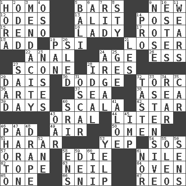 ACROSS 1. Like (prefix) 5. Long, evenly shaped pieces 9. ___ Haven, CT 12. Lyric poems 13. Came down and settled, as after flight 14. Introduce or present, as a question 15. Western Nevada city 16. Kenny Rogers chart-topper in '80 17. Roll call or roster of names 18. Increase 19. 23rd letter of the Greek alphabet 21. Failure 22. Of or related to the anus 24. Grow older 26. Double-curved letter 27. Biscuitlike quick bread 28. Angers 29. Raised platform 30. Evade 32. Torque (variant) 36. Johnson of "Laugh-In" 37. Ocean 38. At sea 39. 24-hour periods 40. Any of the three canals of the cochlea 42. Play the lead 43. Of the mouth 44. 61 cubic inches 46. Groovy apt. 49. Wind 50. Sign of things to come 51. Ethiopian city, capital of Harari 53. Slangy assent 54. Distress signal 57. NW Algerian seaport 58. Singer Brickell 61. The longest river in the world 62. Drink excessively 63. Famous astronaut Armstrong 64. Baking chamber 65. Single 66. Sever or remove by pinching or nipping 67. Vintage cars DOWN 1. Israeli folk dance 2. Wrote a lyric poem 3. Ananias' fault 4. Bear (Spanish) 5. Indonesian resort city 6. Insect wing 7. To free from 8. Filthy place 9. Trap for birds or small mammals 10. _____ Park, CO 11. Puts on (as clothing) 14. Adept person 19. Baking dish 20. Downhill vehicle 21. French article 23. Olfactory organs 24. Therefore, facetiously 25. Unit of force equal to gravity 27. "Two Mules for Sister ____" 28. Perfect 29. Male parent 31. Motion picture award 32. Clothes sense 33. Clearly or manifestly demonstrative 34. Located in or toward the back 35. Auto 40. Indian title of respect (Mr.) 41. Medicinal plant 43. Boat paddle 45. Mischievous child 46. Picture 47. Composer Copland 48. Window treatment 52. A saturated hydrocarbon 53. Sharp bark 55. Margarine 56. Elected reps. 58. Followers of ems 59. Lair 60. One more than two 61. Not either
