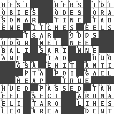 ACROSS 1. Behest 5. Confederate soldiers (slang) 9. Small child 12. Off-Broadway awards 14. Lyric poems 15. Mouth or opening 16. Echolocation 17. Prong on a fork 18. Bar bill 19. Compass dir. 20. Strong, restless desires 23. Snakelike fish 24. Russian ruler of old 25. Likelihood 27. Aroma 30. Was introduced to 32. Born 33. Indonesian resort city 34. Indian skirt 36. Compass dir. 38. One (Scot) 39. Small amount or degree 40. Superhero pair 43. Girls' org. (abbr.) 46. Send forth 48. Opposed to 49. Parent Teacher Assoc. 51. Luau course 52. Highlander 53. Pile 54. Loyal 56. Became colored 58. Went by 61. Scottish cap 64. Snakelike fish 65. Religious group 66. Odor 68. Connecticut Ivy Leaguer 69. Pacific island yam 70. Citrus fruits 71. Lion 72. Type of rug 73. Gouge DOWN 1. Flexible conduit 2. Inky black, to poets 3. Trig term 4. Afternoon social gathering 5. Writer of Portnoy's Complaint (1969) 6. Singer Brickell 7. Gillaume's butler role 8. Compass dir. 9. Lugs 10. Of the mouth 11. Bar bills 13. Indian titles of respect 21. Scottish caps 22. Make 23. Paradise 24. Three (prefix) 26. Lair 27. Chief or king in Benin or Nigeria 28. One of the 12 tribes of Israel 29. Cassini of fashion 31. _____ steamer (cargo ship) 35. Foolish or stupid persons 37. Pulitzer Prize-winning author Ferber 41. Shoshoni 42. Lubricate 44. Drove too fast 45. _ moment's notice (2 wds.) 47. Hoop that covers a wheel 48. Grow older 50. Seem 53. Sun: prefix 55. Allodial 56. Person who is morally reprehensible 57. Ubangi River tributary 59. Land measure 60. Portico 61. Heavy book 62. So be it 63. Vertical spar for supporting sails 65. R.R. building 67. To free from