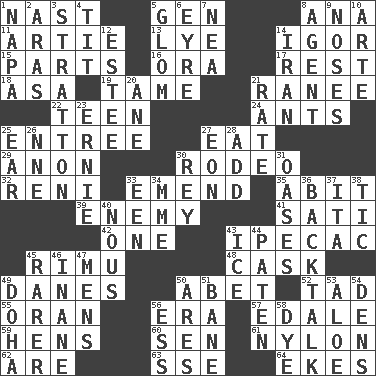 ACROSS 1. Political cartoonist Thomas 5. Commissioned mil. rank 8. Santa ___, CA 11. Nick name for Arthur 13. Sodium hydroxide 14. Russian composer Stravinsky 15. Pieces 16. Mouth or opening 17. Respite 18. White ___ sheet 19. Docile 21. The wife of a rajah (variant) 22. Adolescent 24. Pismires 25. Main course 27. Erode 29. At once, immediately (arch.) 30. Cowboy competition 32. Painter Guido (1575-1642) 33. Make improvements or corrections to 35. "This won't hurt ____!" 39. Foe 41. Suttee (variant) 42. Single 43. Medicinal drug used to evoke vomiting 45. Tall New Zealand timber tree 48. Keg 49. Natives or inhabitants of Denmark 50. Collude with 52. Small boy 55. NW Algerian seaport 56. Period 57. Peak District village in England 59. Coop moms 60. Elected rep. 61. High-strength synthetic material 62. "We ___ not amused" (Victoria) 63. Compass dir. 64. Makes supply last DOWN 1. California wine valley 2. Ancient river in northeast Turkey 3. Ski resort town in Vermont 4. Teat (slang) 5. Seize upon or latch onto something 6. Jane of fiction 7. Teachers' org. 8. Representative 9. Olfactory organs 10. Johnson of "Laugh-In" 12. First name in cosmetics 14. SW Asia republic 20. A saturated hydrocarbon 21. Assign a rank or rating to 23. Bert's buddy 25. Ewer handle 26. Compass dir. 27. A really long time 28. Find the sum of 30. Marina Del _, California 31. Fertile tracts in a desert 33. Car or cant ending 34. Madame (abbr.) 36. Sass 37. Call ___ day 38. Nervous spasm 40. Good sense 43. Frozen water 44. Eucharist need 45. Less widely known 46. Lacking in sense or substance 47. Not women's 49. Capital of the state of Qatar 50. Ancient Greek god of war 51. Object of repulsion 53. Medicinal plant 54. Habitations of wild animals 56. Double-curved letter 58. Color