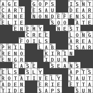 ACROSS 1. Personal question 4. Republicans 8. Is not 12. Draw slowly or heavily 14. Son of Isaac 15. Letter starter 16. French philosopher Descartes 17. Unrelated to defense, as in spending 20. Writer Wiesel 21. "Barney Miller" actor Jack 22. Had dinner 23. Foe 27. Egg locale 29. Algonquian 31. Protracted 34. Fencing necessities 35. Type of rug 36. Silvers or Donahue 39. Experiment locale 41. Austrian river, tributary to the Danube 42. Western Nevada city 43. Japanese brewing company 46. Engineer (abbr.) 47. Goddess of spring and wife of Bragi 48. Relaxation 51. Seines 54. Raised railways 56. Wily 58. Tenement units (abbr.) 61. Producing rotation 66. Drawn tight 67. An important port of Yemen 68. 4th largest of the Great Lakes 69. Singer James 70. Periodic rise and fall of the sea level 71. Plant excrements 72. Player for Phoenix DOWN 1. Measure of real estate 2. Highlander 3. Bert's buddy 4. Commissioned mil. rank 5. Bear (Spanish) 6. Baking dish 7. Soap bubbles 8. Binary compound 9. Legislators 10. Political cartoonist Thomas 11. Family _ (genealogy) 13. Adolescent 18. Age 19. Enemy 24. Environmental prefix 25. Medical imaging device (abbr.) 26. Shout 28. Killed 30. 1973 Nobel Price Winner (Physics) Leo 32. Teachers' org. 33. Slender fish 34. Plants 36. Before (prefix) 37. Layer 38. Consumed 40. Auction offers 44. Regret 45. _ tizzy (2 wds.) 49. Fast jet (abbr.) 50. Connecticut Ivy Leaguer 52. Nathan's nickname 53. Arguments over trivial matters 54. Part of Q.E.F. 55. Farming town in central California 57. Jacques Cousteau's middle name 59. Ballerina skirt 60. Comedian Laurel of Laurel & Hardy 62. One (Scot) 63. Period 64. Mouth edge 65. Affirmative reply