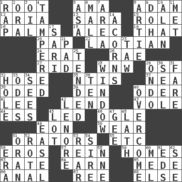 ACROSS 1. Carrot, for example 5. Housemaid (var.) 8. First man 12. Roberta Peters solo 13. "Two Mules for Sister ____" 15. Hero or heavy, e.g. 16. Insides of hands 18. Actor Baldwin 19. Not this but _ 20. Infant food 22. Of or relating to Laos or its people 24. Part of Q.E.F. 26. Actress Charlotte 27. Travel on an animal 28. Compass dir. 29. Order of Saint Francis (abbr.) 32. Stockings 35. Nuclear Threat Initiatives 37. Teachers' org. 38. Wrote a lyric poem 39. Lair 40. Baltic tributary 41. Area sheltered from the wind 42. Grant temporary use of 43. Grand slam 44. Double-curved letter 45. Directed 46. Stare at amorously 49. Age 50. Put on (as clothing) 51. Speakers 55. And so on (abbr.) 56. Greek god of love 57. It's straight from the horse's mouth 59. Dwellings 63. Pace 64. Merit 65. Ancient Persian 66. Of or related to the anus 67. To riddle 68. Otherwise DOWN 1. Strike 2. Mouth or opening 3. Lubricate 4. ________ with (broke a safety seal) 5. White ___ sheet 6. Promenade 7. Type of rug 8. Nick name for Arthur 9. Capital of the state of Qatar 10. Actor Alda or Thicke 11. Was introduced to 14. Oak nuts 17. Indian skirt 21. Writing tablet 23. The 23rd letter of the Hebrew alphabet 25. Watched over 28. Light entry point 29. Southwest Nigerian state 30. Sew up the eyelids of hawks and falcons 31. Conductor's collection 32. Hollow 33. Lyric poems 34. Perceives with the eye 36. "___ Little Indians" 40. Conquer 42. Poe poem 45. Car dealer's back yard 47. Turn to the right 48. Thin strip of wood or metal 49. Artist's stand 51. NW Algerian seaport 52. Roll call or roster of names 53. Rump 54. Male parent of an animal 56. Epoch 58. Compass dir. 60. Cartoonist voice _ Blanc 61. Begley and Asner 62. Observe