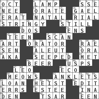 ACROSS 1. Sep. follower 4. Desk light 8. Compass dir. 11. Born 12. Speak pompously 14. Highlander 15. Part of Q.E.F. 17. Brizilian seaport 18. Monetary unit of Yemen 19. Slender, wiry 21. Free from disturbance or agitation 23. Two (Sp.) 24. Followers of ems 25. Adolescent 27. Skim 30. Nonscientific branch of learning 31. Speaker 34. Actress Charlotte 37. Elected rep. 38. Eskimo relative 39. Mouth or opening 40. Alias (abbr.) 41. Oozed 43. Was introduced to 44. Fermented drink made from hops 45. United States Postal Service (abbr.) 47. Lion 49. Environmental prefix 50. Catcalls? 52. Short socks 56. Grant temporary use of 57. Robbery 60. Prepare for publication 61. Blunders 62. First name in cosmetics 63. _ tizzy (2 wds.) 64. Lair 65. Russian ruler of old 66. Car or cant ending DOWN 1. Singles 2. Foregone conclusion 3. Pull apart 4. Yearns 5. Like ___ of sunshine 6. Floor covering 7. Parent Teacher Assoc. 8. Travel by water 9. Lick closed 10. Pipe bend 13. Raised railways 14. Broad smile 16. Periodic rise and fall of the sea level 20. Words to Nanette 22. "___ Little Indians" 25. Long journey 26. Inactive volcano in Sicily 27. Navigate 28. Clever action or accomplishment 29. Johnson of "Laugh-In" 30. White ___ sheet 32. To erase 33. Toward shelter 34. Frolic 35. Ancient Greek god of war 36. Erode 42. Evade 44. Arrow shooter 46. Not divided or shared with others 47. Memorize 48. Immeasurably long periods of time 49. Keyboard key 50. Greater amount 51. A female animal or person 52. Toward the sea 53. Singer Brickell 54. Prong on a fork 55. Comedian Laurel of Laurel & Hardy 56. Directed 58. Eastern Standard Time (abbr.) 59. ___ a Wonderful Life