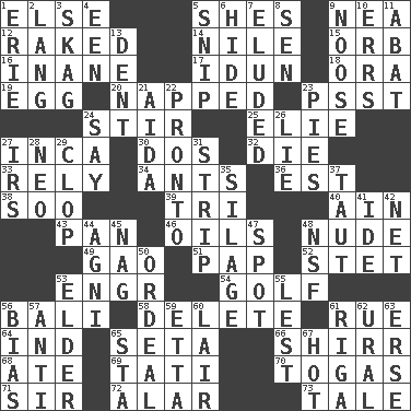 ACROSS 1. Otherwise 5. "______ My Girl" (Turtles hit) 9. Teachers' org. 12. Moved through 14. "Death on the ____" 15. Globe 16. Silly 17. Goddess of spring and wife of Bragi 18. Mouth or opening 19. Ovum 20. Slept 23. Inconspicuous attention getter 24. Disorderly outburst 25. Writer Wiesel 27. South American Indian 30. Two (Sp.) 32. Pass on 33. Depend 34. Pismires 36. Eastern Standard Time (abbr.) 38. "Barney Miller" actor Jack 39. Three (prefix) 40. The 18th letter of the Arabic alphabet 43. Baking dish 46. Lubricates 48. Naked 49. E Mali city 51. Infant food 52. Proofreading order 53. Engineer (abbr.) 54. Eighteen holes 56. Indonesian resort city 58. Keyboard key 61. Sorrow 64. Indiana (abbr.) 65. Bristle 66. Bake eggs in their shells 68. Had dinner 69. Jacques of French films 70. Ancient Roman robes 71. Title for a knight 72. Having or resembling wings 73. Lie DOWN 1. One of the Great Lakes 2. Long (Scottish) 3. Heroin 4. Car or cant ending 5. Sever or remove by pinching or nipping 6. Flintstone garb 7. Dodged 8. Elected rep. 9. Trap for birds or small mammals 10. Blunders 11. Blind as ____ 13. Scratch 21. Opera by Verdi 22. Right away 23. Sliced desserts 24. Declare 26. Untruth 27. Big collection agency 28. Modern: prefix 29. Hoof sound 31. Empty completely 35. Fodder prepared in a silo 37. Drawn tight 41. Binary compound 42. Fish or hair follower 44. Hindu god of fire 45. Tired old horse 47. Specific locale 48. Overdraft (abbr.) 50. Severe or trying experience 53. A person who is older than you are 55. For fear that 56. Prejudice 57. Against 59. Singer James 60. Den 61. Capital of Latvia 62. Mountain range 63. Celtic language 65. R.R. building 67. Being at a high temperature