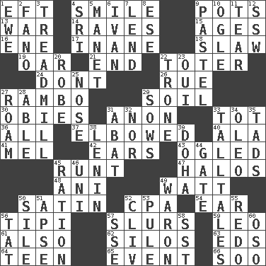 ACROSS 1. Bank Draft (abbr.) 4. Grin 9. Plant holders 13. Armed conflict 14. All-night dance parties 15. Grows older 16. Compass dir. 17. Lacking in sense or substance 18. Cole _ (cabbage dish) 19. Boat paddle 21. Conclusion 22. Carrier 24. Do not 26. Regret 27. Role for Stallone 29. Earth 30. Off-Broadway awards 31. Soon (poet.) 33. Small child 36. 100% 37. Turned at an angle; bent 40. Wing 41. Cartoonist voice _ Blanc 42. Hearing organs 43. Stared 45. Undersized animal 47. Saint headwear 48. Cuckoo 49. Electrical Unit 50. Smooth fabric 52. Tax preparer (abbr.) 54. Hearing organ 56. Native american tent (variation) 57. Runs notes together 59. Lion 61. In addition 62. Grain storage towers 63. Begley and Asner 64. Adolescent 65. Happening 66. "Barney Miller" actor Jack DOWN 1. She-sheep 2. Papal veil 3. Excercise machine 4. Indian title of respect (Mr.) 5. French painter Edouard 6. _ the terrible 7. Grant temporary use of 8. Compass dir. 9. Soft color 10. Stare 11. Lacerate 12. Compass dir. 20. Loose flowing garment 22. Heavy duty weighing machine 23. Fr. "Yes" 25. Characteristic smell of wine 27. Wander 28. Competent 29. Sty mamas 31. Blind as ____ 32. And not 33. Baron Munchausen's specialties 34. Margarine 35. Small boys 38. Soviet premier 1918-24 39. Capital of the state of Qatar 44. Yard entry 45. Food allowance for one day 46. Corn or form start 49. Make _____ (do battle with) 50. Drop; flow; fall 51. Domed church section 52. 154 in Roman numerals 53. Whine 55. Redecorate 56. Make lace 57. Compass dir. 58. Fast jet (abbr.) 60. Bear (Spanish)
