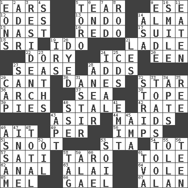 ACROSS 1. Hearing organs 5. Pull into pieces 9. Compass dir. 12. Lyric poems 13. Southwest Nigerian state 14. _ mater 15. Political cartoonist Thomas 16. Do over again 17. Set or collection 18. Indian title of respect (Mr.) 19. Wedding promise 21. Dipping utensil 22. Dinghy 24. Frozen water 26. Car or cant ending 27. Gospel singer Marvin 28. Does sums 29. Patter 30. Natives or inhabitants of Denmark 32. Play the lead 36. Bowlike part 37. Ocean 38. Drink excessively 39. Sliced desserts 40. Having lost freshness 42. Assign a rank or rating to 43. SW Saudi Arabia district 44. Unmarried girls 46. Small island 49. For each 50. Naughty children 51. Snout, nose 53. R.R. building 54. Small child 57. Suttee (variant) 58. Pacific island yam 61. Lacquered or enameled metalware 62. Of or related to the anus 63. Jai ____ 64. Grand slam 65. Cartoonist voice _ Blanc 66. Highlander 67. ____ Jay Lerner DOWN 1. Immeasurably long periods of time 2. The sixth month of the Jewish calendar 3. Home 4. Fast jet (abbr.) 5. "Corrida" creature 6. Compass dir. 7. Find the sum of 8. Friend of Pooh 9. Dodge 10. Grin 11. Consumed 14. White ___ sheet 19. Big collection agency 20. Colored 21. French article 23. Curses 24. Perfect 25. Music discs 27. Indian skirt 28. Approach 29. Head covering 31. Moving or stirring 32. Long narrow piece of something 33. Inedible or poisonous agaric 34. Flats, for short 35. To sift 40. Compass dir. 41. Give off 43. Fitting 45. Housemaid (var.) 46. Indian state 47. Empty; void 48. "_____ Recall" 52. Petroleum 53. The visible part of the earth's surface 55. Water jar 56. Adolescent 58. Label 59. Wing 60. Actress Charlotte 61. Federal power corp.