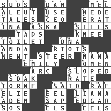 ACROSS 1. Soap bubbles 5. Daniel's nick name 8. Cartoonist voice _ Blanc 11. Native American of Southwest Alaska 13. Purpose 14. Ancient Persian 15. Falsehoods 16. Corporate head (abbr.) 17. Part of Q.E.F. 18. _ tizzy (2 wds.) 19. "____ silly question..." 21. Beverly of Met fame 22. Small boys 24. Leg joint 25. Rest room 27. Heredity factor (abbr.) 29. Small Philippine buffalo 30. Debaucheries 32. Left 33. Bull 35. Nanny 39. Poet Dickinson 41. Sign of something about to happen 42. Curve 43. Inclined 45. Neighbor of Neb. 48. Assign a rank or rating to 49. Singer Mel 50. Stated 52. Actress Charlotte 55. Writer Wiesel 56. Snakelike fish 57. Climbing, woody, usually tropical vines 59. Arabian gulf 60. Plant excrement 61. _ Allan Poe 62. Mayday 63. Raised railways 64. Snakelike fish DOWN 1. Suttee (variant) 2. ____ Bator, Mongolia 3. Accusation by an informer 4. Institute legal proceedings 5. Evade 6. Toward the sea 7. Modern: prefix 8. Haggard of country music 9. Peak District village in England 10. Allows 12. Sadhe (variant) 14. Chow _ 20. Fast jet (abbr.) 21. Three-handed card game 23. Having winglike extensions 25. The 23rd letter of the Hebrew alphabet 26. Single 27. Expire 28. Or not 30. Marina Del _, California 31. Snob 33. Title for a knight 34. Affectionate concern, for short 36. Electrical Measurement 37. Born 38. Plus 40. Create 43. Indian title of respect (Mr.) 44. Dipping utensil 45. Twentieth part of a lira 46. Frees from moisture 47. So be it 49. Beverages made from leaves 50. Lick closed 51. High mountains 53. Of or related to the anus 54. Hearing organs 56. Compass dir. 58. Binary compound