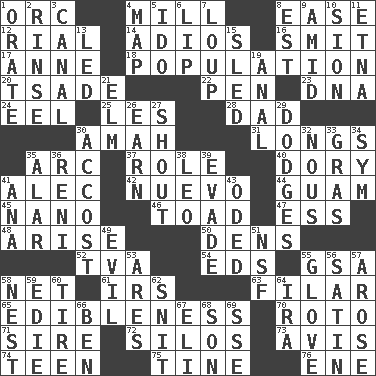 ACROSS 1. The grampus (Milton) 4. Place where flour is made 8. Comfort 12. Monetary unit of Yemen 14. Goodbye (Sp.) 16. Stricken, poetically 17. Singer Murray 18. Census information 20. Sadhe (variant) 22. Animal enclosure 23. Heredity factor (abbr.) 24. Snakelike fish 25. French article 28. June honoree 30. Nanny 31. Yearns 35. Curve 37. Hero or heavy, e.g. 40. Rowboat 41. Actor Baldwin 42. New (sp.) 44. Island territory of the United States 45. Billionth: prefix 46. Frog relative 47. Curvy letter 48. Ascend 50. Habitations of wild animals 52. Federal power corp. 54. Begley and Asner 55. Girls' org. (abbr.) 58. Fish or hair follower 61. Big collection agency 63. Having threads 65. The property of being fit to eat 70. Printing process, for short 71. Male parent of an animal 72. Grain storage towers 73. Opinion 74. Adolescent 75. Prong on a fork 76. Compass dir. DOWN 1. Speak pompously 2. Remove soap 3. Lessep's creation 4. Atlas unit 5. Wedding promise 6. Mouth edge 7. Central Nebraska county 8. Eastern Standard Time (abbr.) 9. Among 10. The Jewish people; Israel 11. Inactive volcano in Sicily 13. Directed 15. Downhill vehicle 19. Of or related to the anus 21. Shade tree 26. Merit 27. Yell 29. Evades 30. Buttonhole 32. Horse sense 33. Pate de foie ____ 34. Symbol (abbr.) 35. Having or resembling wings 36. Painter Guido (1575-1642) 38. Lion 39. Dodge 41. Santa ___, CA 43. Wrote a lyric poem 49. Tending to cause great harm 51. Overdraft (abbr.) 53. Ancient Greek god of war 55. Michael Jackson trademark 56. Smooth fabric 57. Came up 58. Egg locale 59. Singer Brickell 60. Become fatigued 62. In a ____ (agitated or irritated) 64. Lyricist Gershwin 66. Benjamin's nick name 67. Biblical high priest 68. Male offspring 69. Compass dir.