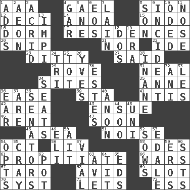 ACROSS 1. American Automobile Association (abbr.) 4. Highlander 8. The Jewish people; Israel 12. Tenth: prefix 14. Small Philippine buffalo 15. Southwest Nigerian state 16. Dormintory (informal) 17. Homes 20. Sever or remove by pinching or nipping 21. And not 22. Binary compound 23. Simple song 27. Expressed in words 29. Be footloose 31. Actress Patricia 34. Settings 35. Queen of England 1702-14 36. Comfort 39. R.R. building 41. Nuclear Threat Initiatives 42. Type of rug 43. Follow as a consequence or result 46. Monthly bill 47. Within a short period 48. At sea 51. Annoying sound 54. Sep. follower 56. 54 in ancient Rome 58. Lyric poems 61. Conciliate 66. Armed conflicts 67. Pacific island yam 68. Enthusiastic 69. Narrow, elongated depression 70. System (abbr.) 71. Allows 72. Curvy letter DOWN 1. Does sums 2. Age 3. Bitter 4. Slender fish 5. A saturated hydrocarbon 6. Greek goddess of the dawn 7. (Had) reclined 8. Male child 9. Event 10. Wrote a lyric poem 11. Olfactory organ 13. Body of Kaffir warriors 18. Two (Sp.) 19. Period 24. Three (prefix) 25. Small child 26. Jacques Cousteau's middle name 28. Empty; void 30. _____ Park, CO 32. Cuckoo 33. French article 34. Theater features 36. Ewer handle 37. "We ___ not amused" (Victoria) 38. Elected representatives 40. At once, immediately (arch.) 44. "Barney Miller" actor Jack 45. Single; one (prefix) 49. Biblical high priest 50. Small island 52. Sty mamas 53. Peak District village in England 54. Elects 55. Supercomputer manufacturer 57. Small bottle 59. Greek god of love 60. Fast planes 62. Cooking vessel 63. "___ Maria" 64. Teat (slang) 65. Begley and Asner