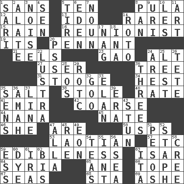 ACROSS 1. Without 5. Nine, plus one 8. Monetary unit of Botswana 12. Medicinal plant 13. Wedding promise 14. Less widely known 15. Precipitation 16. One who advocates reunion 19. It is 20. Pre-World Series prize 21. Snakelike fish 23. E Mali city 24. Keyboard modifier key 27. One who uses or employs something 30. Woody plant 31. Moe Howard, for one 34. Behest 35. Table seasoning 38. Took without asking 40. Pace 41. Arab leader 42. Unrefined 44. Grandmother 45. Nathan's nickname 46. A female animal or person 47. "We ___ not amused" (Victoria) 50. United States Postal Service (abbr.) 53. Of or relating to Laos or its people 57. And so on (abbr.) 59. The property of being fit to eat 63. Austrian river, tributary to the Danube 64. Damascus' land 65. One (Scot) 66. Drink excessively 67. Oceans 68. R.R. building 69. American tennis player Robert DOWN 1. Indian skirt 2. Having winglike extensions 3. Annoying sound 4. Elected rep. 5. Hoop that covers a wheel 6. Genesis locale 7. Part of speech 8. Baking dish 9. RI univ. 10. French article 11. Tate display 14. Printing process, for short 17. Tired old horse 18. _ tizzy (2 wds.) 20. Inconspicuous attention getter 22. A period of five years 24. Length times width 25. For fear that 26. Wig 28. Greek goddess of the dawn 29. College mil. group 30. Triads 32. Thick or sticky substance 33. Flair 35. Elected reps. 36. Wet nurse 37. Actor's bit 39. Period 43. Astound 47. Silent film actress Nazimova 48. Actress Charlotte 49. A really long time 51. Mexican monetary units 52. Staphylococcus 54. Afternoon social gatherings 55. Is not 56. Toward the sea 58. Algonquian 59. Double-curved letter 60. Color 61. Lyricist Gershwin 62. Twice 63. Call ___ day