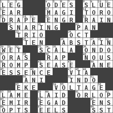 ACROSS 1. Part of a journey 4. Lyric poems 8. Turn sharply 12. Hearing organ 13. Wise men 14. "Corrida" creature 15. Window treatment 18. Engineer (abbr.) 19. Precipitation 20. Catching in a trap 22. Baking dish 23. Musical group of three 24. Sep. follower 25. Nine, plus one 26. Refrain by choice 30. Soggy 33. Any of the three canals of the cochlea 36. Southwest Nigerian state 37. Mouths or openings 39. Hit sharply and swiftly 40. Horse sense 41. Frolic 42. Gospel singer Marvin 44. A saturated hydrocarbon 45. Center 47. By way of 50. Black tropical American cuckoo 51. _ china 53. Make supply last 54. Electrical Measurement 57. Unable to walk 59. Put down 61. Fourth or lowest deck 63. Arab leader 64. Mild oath 65. Followers of ems 66. Elects 67. Snakelike fish 68. Fast jet (abbr.) DOWN 1. Directed 2. Hearing organs 3. Let have 4. Sign of things to come 5. Mild oath, euphamism for damn 6. Ovum 7. Title for a knight 8. Ski resort town in Vermont 9. Grant temporary use of 10. RI univ. 11. A really long time 16. Component 17. 4th largest of the Great Lakes 21. Charged atoms 22. Personal Computers (abbr.) 24. Chief or king in Benin or Nigeria 26. High mountains 27. Small Philippine buffalo 28. Goddess of spring and wife of Bragi 29. Olfactory organ 30. Had on 31. Greek god of love 32. Scottish caps 34. Algonquian 35. Auto club (abbr.) 38. Orators 42. _-fi 43. Morally bad or wrong 46. Compass dir. 48. To the inside or interior of 49. The sixth month of the Jewish calendar 52. Stares at amorously 53. Send forth 54. Small bottle 55. Likelihood 56. Immeasurably long periods of time 57. Lion 58. Electrical Unit 59. Area sheltered from the wind 60. Grow older 62. Pacific Standard Time (abbr.)
