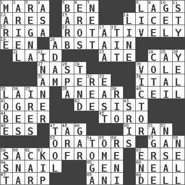 ACROSS 1. Hindu Mythology: god of death 5. Benjamin's nick name 8. Straggles 12. Ancient Greek god of war 13. "We ___ not amused" (Victoria) 14. It is permitted: Lat. 15. Port city in Latvia 16. Producing rotation 19. Car or cant ending 20. Refrain by choice 21. Put down 23. Had dinner 24. Island 27. Political cartoonist Thomas 30. Short-tailed, large-bodied rat 31. Electrical Unit 34. Slanted text style (abbr.) 35. (Had) reclined 38. Approach 40. To provide with a ceiling 41. Legendary monster 42. Cease 44. Fermented drink made from hops 45. "Corrida" creature 46. Curvy letter 47. Label 50. SW Asia republic 53. Speakers 57. Separate the seeds from cotton 59. Italian handbag shop? 63. Celtic language 64. Slow-paced one 65. Commissioned military rank (abbr.) 66. Anneal 67. Canvas cover 68. Black tropical American cuckoo 69. Small valley DOWN 1. Female horse 2. Satellite of Uranus 3. Rain (Swedish) 4. White ___ sheet 5. Sharp remark 6. Greek god of love 7. Remaining after all deductions 8. 54 in ancient Rome 9. Adept person 10. Set 11. Filthy place 14. Actor's bit 17. American Automobile Association (abbr.) 18. Teat (slang) 20. First of billions? 22. Sillier 24. ____ d'Azur (French Riviera) 25. Jai _ 26. Shout 28. Health resort 29. Be inclined (to) 30. Winning man's name 32. To separate or throw off 33. 90 degrees 35. Ear part 36. Grows older 37. Angers 39. River (Sp.) 43. Indian titles of respect 47. Utensil 48. Sandy's bark 49. Slender fish 51. Match 52. Rhinal 54. Ancient Roman robe 55. Sign of something about to happen 56. Painter Guido (1575-1642) 58. 1994 drama film starring Jodie Foster 59. Fast jet (abbr.) 60. Santa ___, CA 61. Automobile 62. Monetary unit of Laos 63. Conclude
