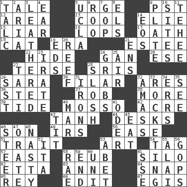 ACROSS 1. Story 5. Goad 9. Pacific Standard Time (abbr.) 12. Length times width 13. Calm and collected 14. Writer Wiesel 15. One who doesn't tell the truth 16. Chops off 17. Pledge 18. Domesticated feline 19. Epoch 21. First name in cosmetics 22. Flintstone garb 24. Separate the seeds from cotton 26. Compass dir. 27. Laconic 28. Indian titles of respect 29. "Two Mules for Sister ____" 30. Having threads 32. Ancient Greek god of war 36. Proofreading order 37. Director Reiner 38. Greater amount 39. Event that recurs at intervals 40. With motion or animation 42. Land measure 43. Hyperbolic tangent 44. Writing tables 46. Boy, to dad 49. Big collection agency 50. Relaxation 51. Distinguishing feature 53. Tate display 54. Label 57. Compass direction 58. Reuben's nickname 61. Grain storage tower 62. Singer James 63. Queen of England 1702-14 64. Fastener 65. Marina Del _, California 66. Prepare for publication 67. Armor plate that protects the chest DOWN 1. Baby powder 2. Roberta Peters solo 3. Tough but pliablecoriaceous 4. Ewer handle 5. Southern CA. univ. 6. Friend of Pooh 7. Republican Party 8. Raised railways 9. Food holder 10. Locates 11. Giggle 14. Greek goddess of the dawn 19. Begley and Asner 20. Coral collection 21. Followers of ems 23. Feeling or showing extreme anger 24. Takes hold of 25. Wind 27. Jacques of French films 28. Make a splashing sound 29. Fast jet (abbr.) 31. Metal shackles 32. Collect or gather 33. Shooting up abruptly 34. Blunders 35. Perceive with the eye 40. Spoil 41. River in Europe 43. Teat (slang) 45. Erode 46. Navigate 47. Declaim 48. Thoroughly unpleasant 52. Call ___ day 53. Collude with 55. Mountain range southwest of Kyrgyzstan 56. Republicans 58. Actress Charlotte 59. Conclusion 60. Corn or form start 61. Compass dir.